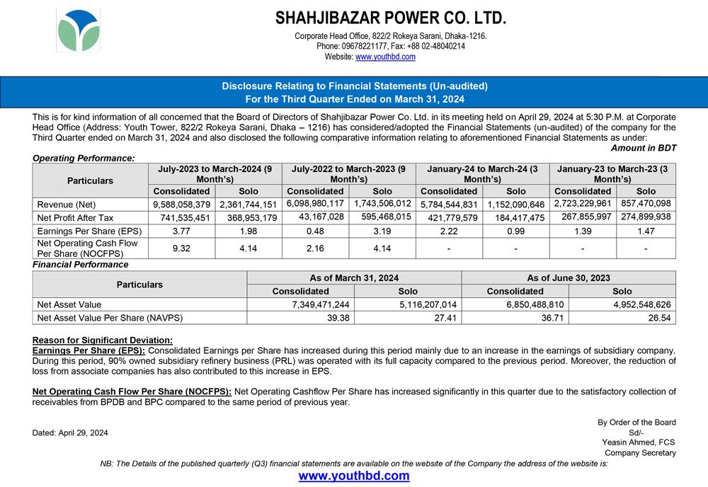 Q1 Financial Statements of Shahjibazar Power Co. Ltd