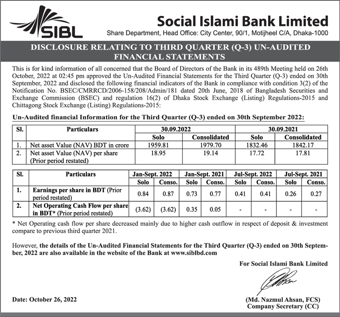 Q3 Un-audited Financial Statements of Social Islami Bank Limited