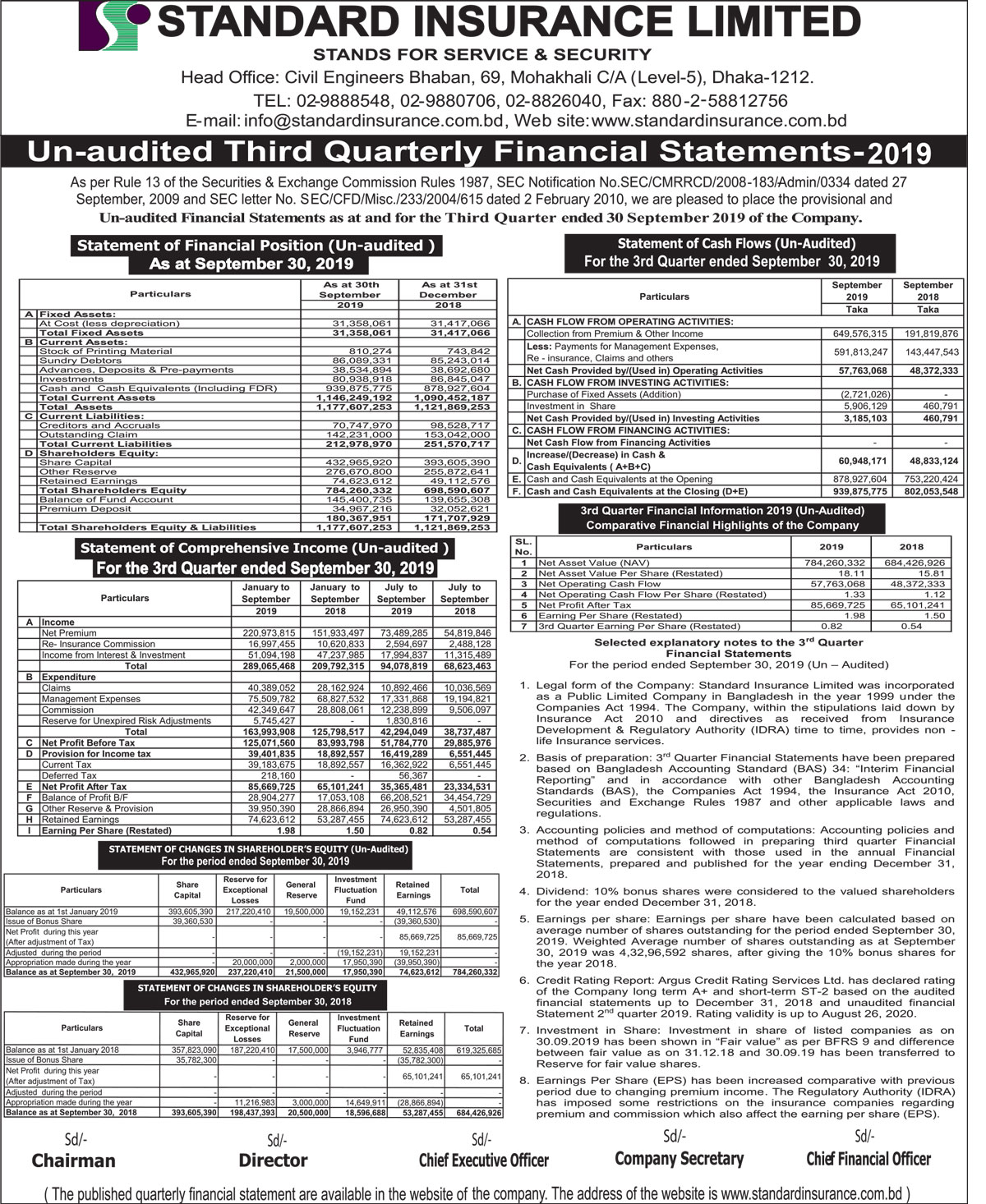 Un-audited Q3 Financial Statements of Standard Insurance Limited