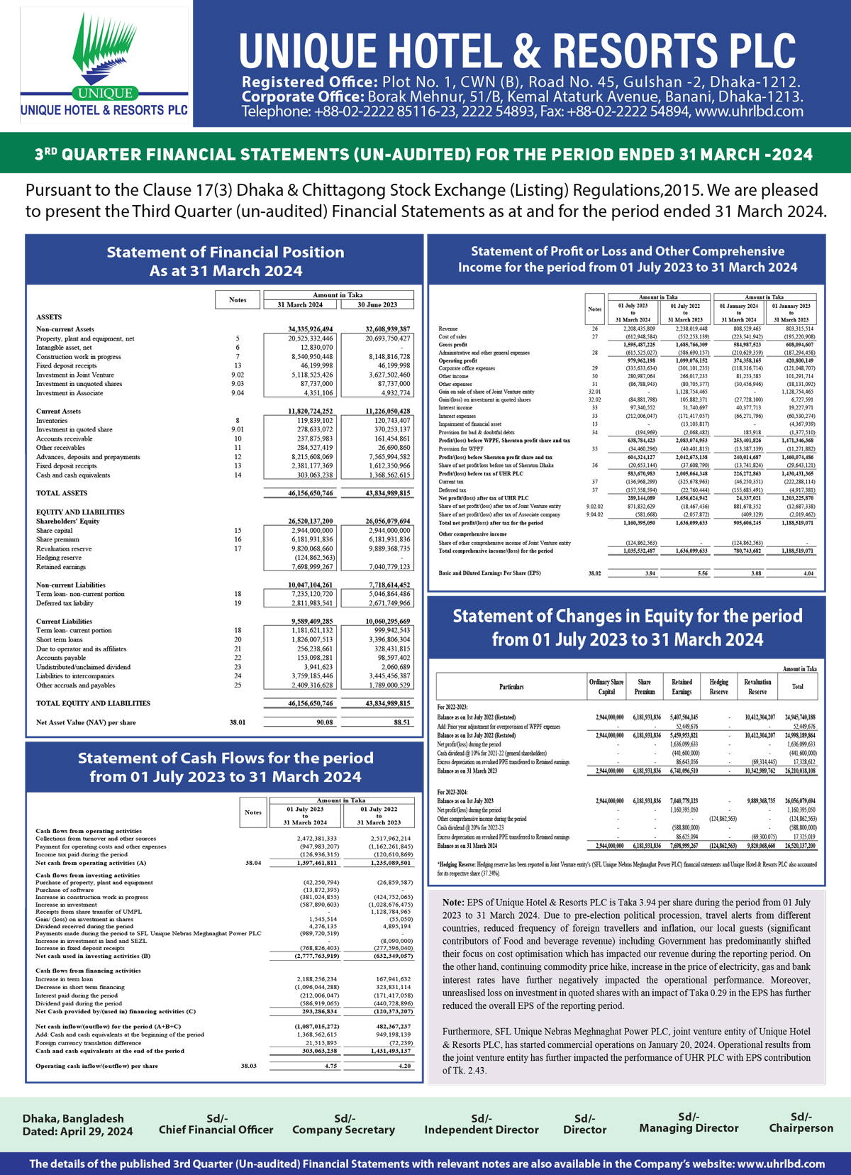 Q1 Financial Statements (Un-audited) of Unique Hotel & Resorts Limited