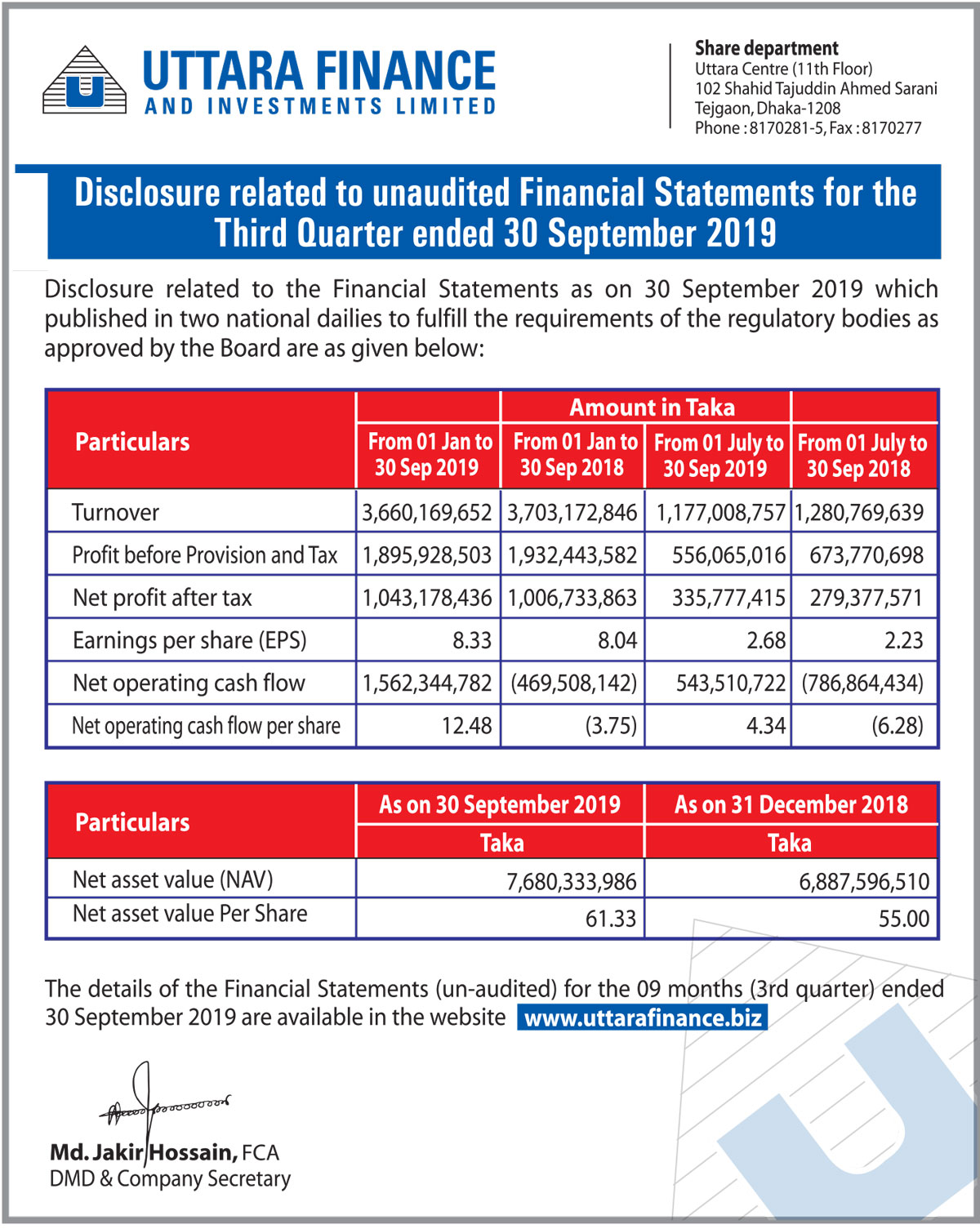 Q3 Un-audited Financial Statements ofUttara Finance and Investments Limited