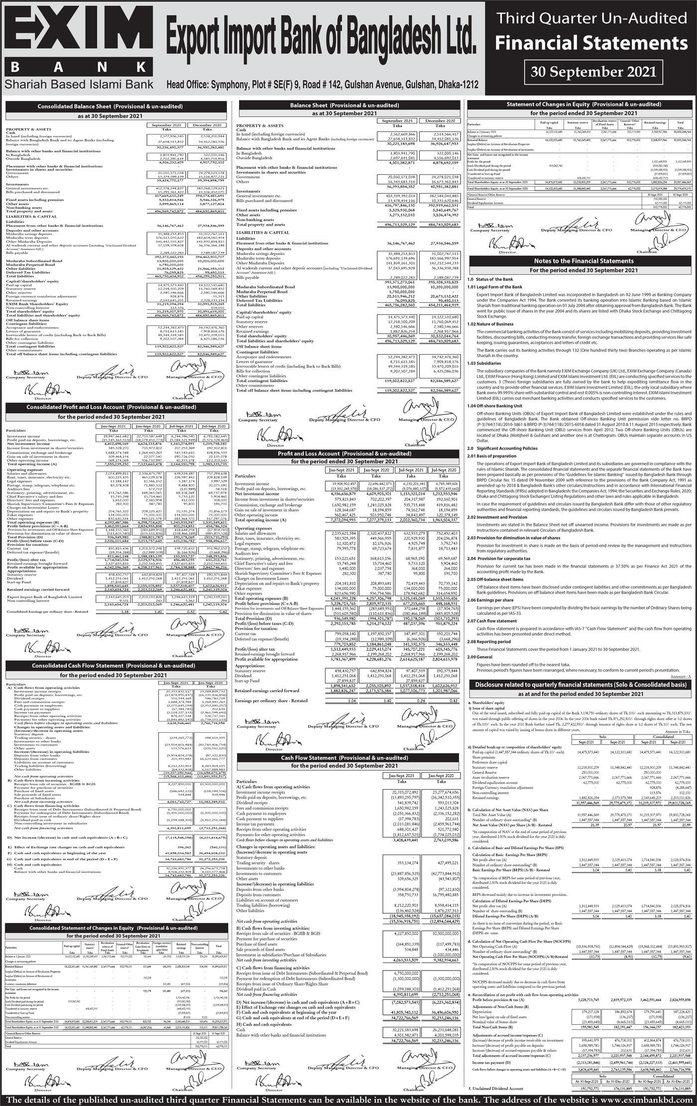 Q3 (Un-audited) Finanical Statements of EXIM Bank