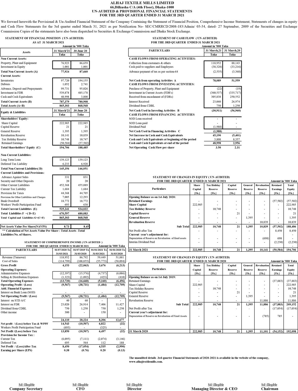 Q3 Un-Audited & Provisional Financial Statements of Alhaj Textile Mills Ltd