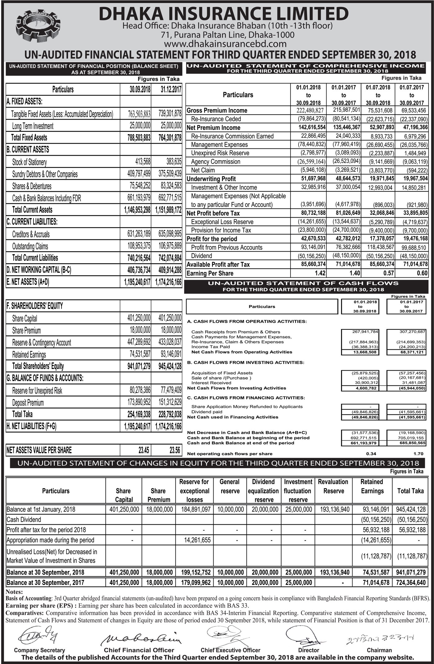Q3 Financial Statements (Un-audited) of Dhaka Insurance Limited