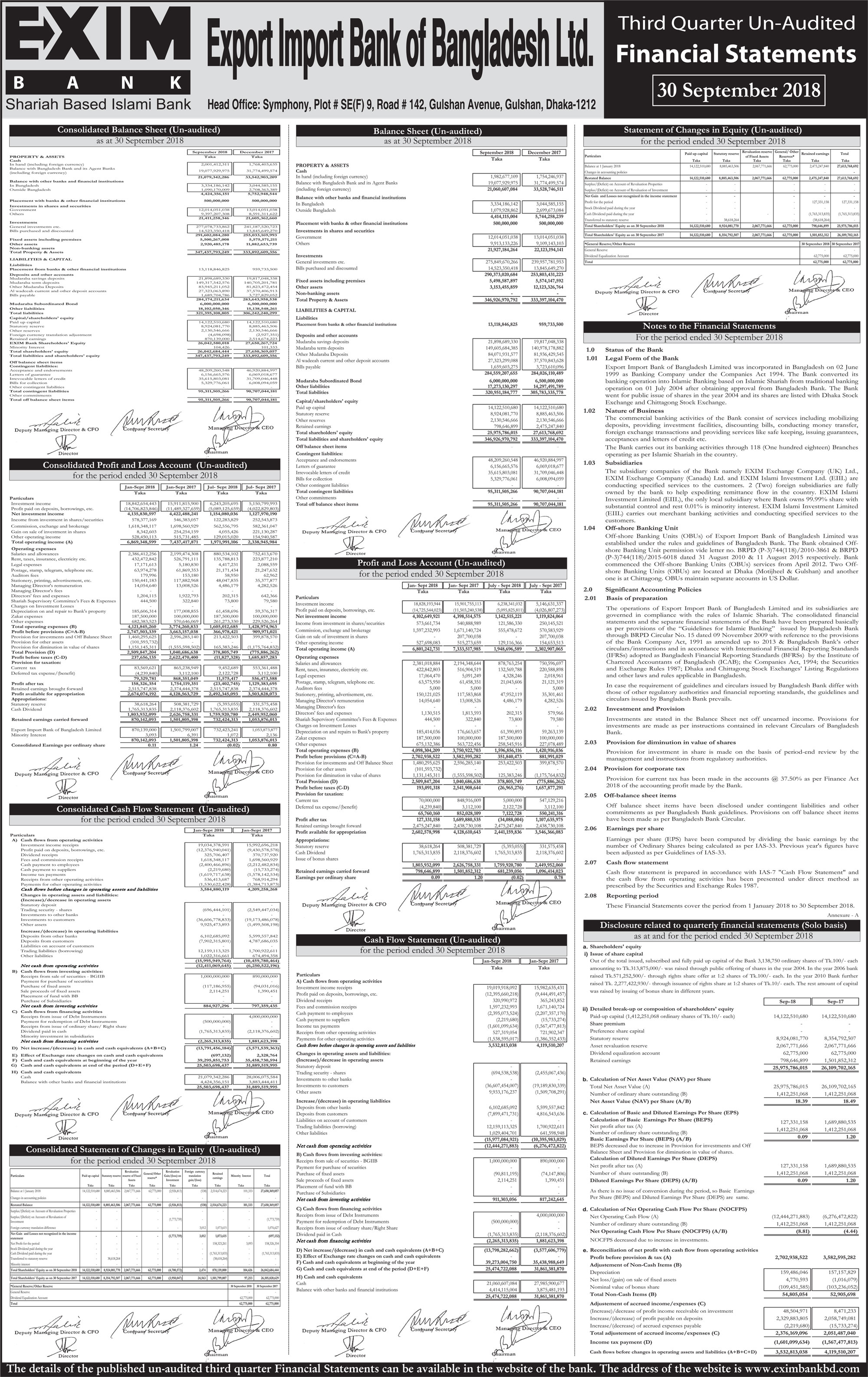Half Yearly Un-audited Financial Statements of EXIM Bank