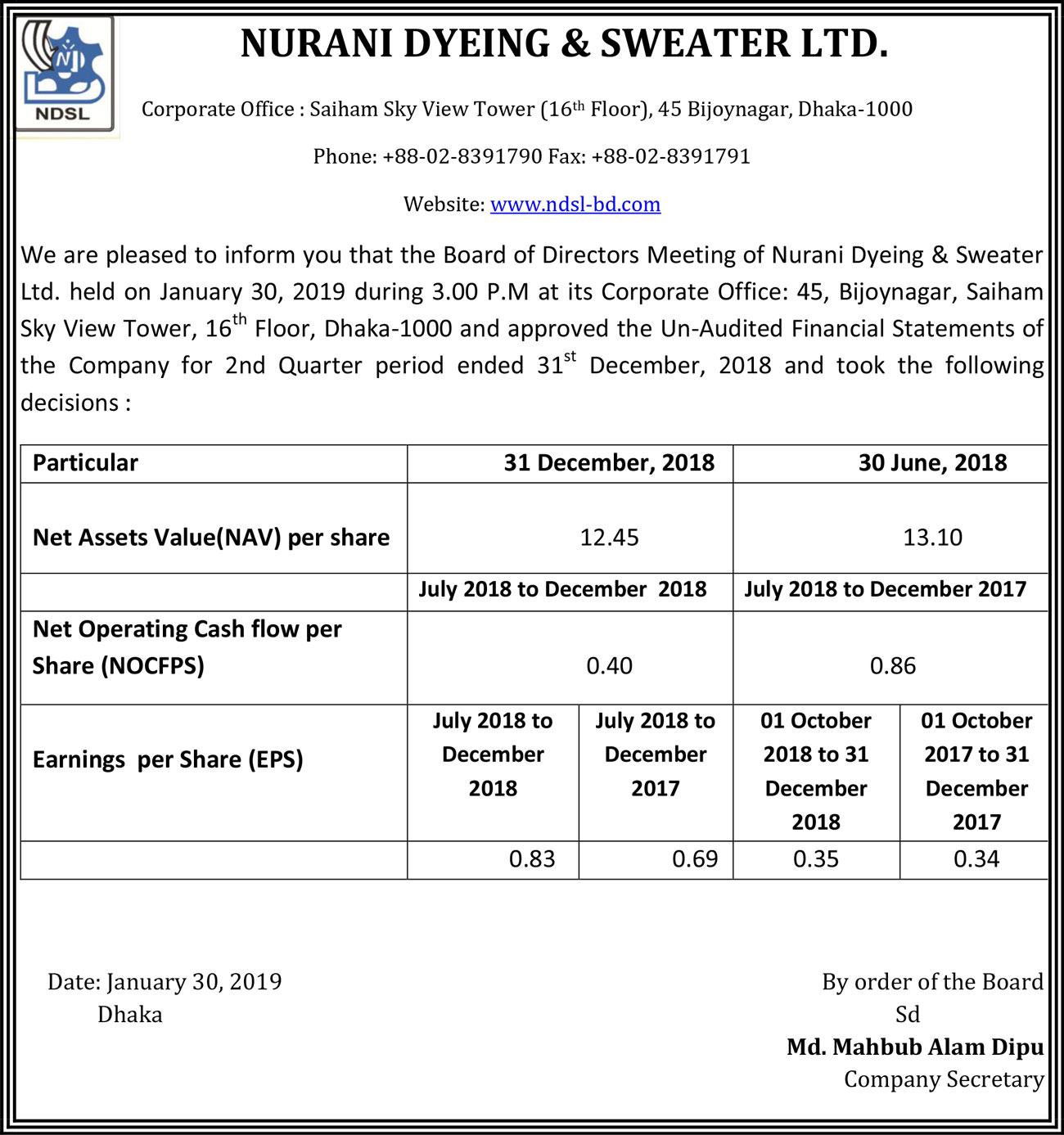 Price Sensitive Information of Nurani Dyeing &Sweater Ltd.