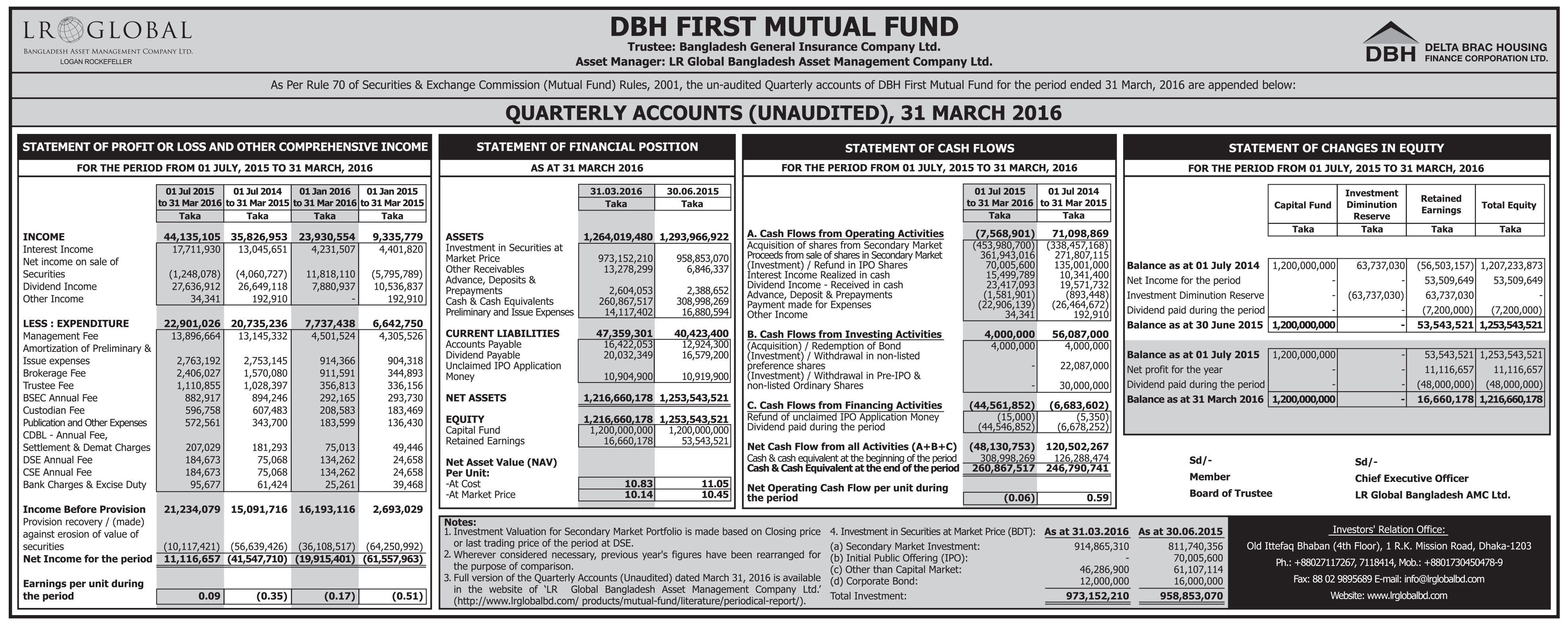 Quarterly Financial Statements (Un-audited) of DBH First Mutual Fund