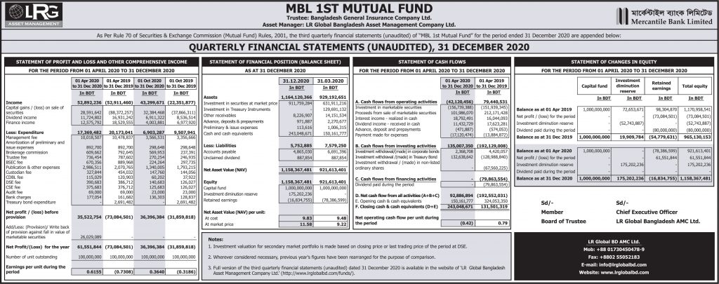 Quarterly Fianancial Statements (Unaudited), 31 December 2020 Of MBL 1st Mutual Fund