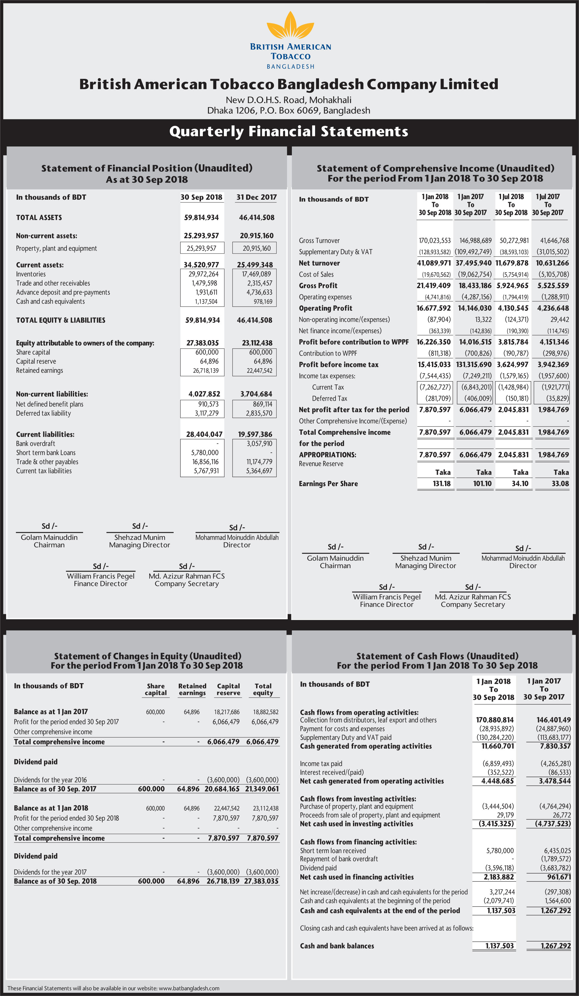 Quarterly Financial Statement of British American Tobacco Bangladesh Company