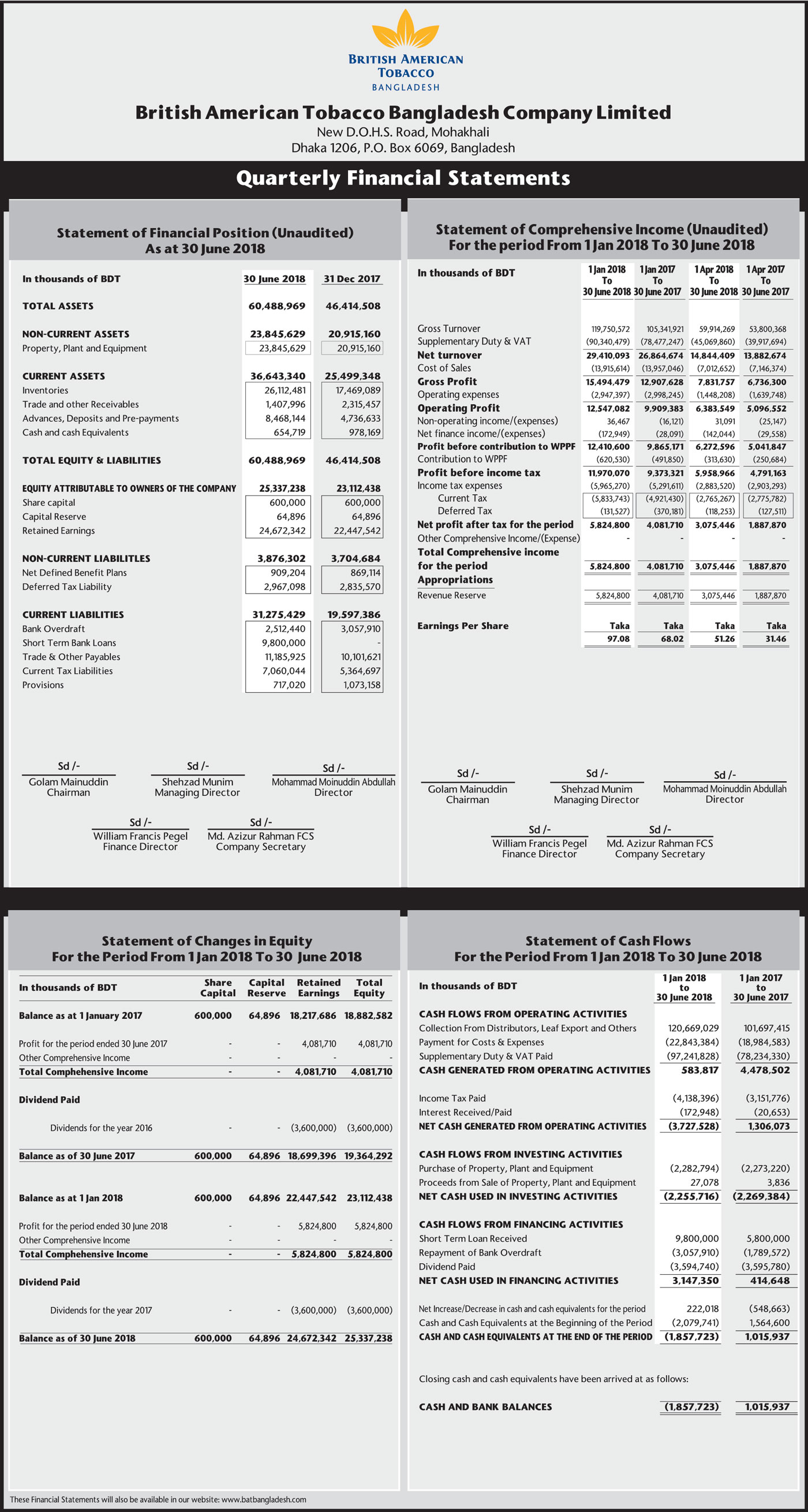 Quarterly Financial Statements of British American Tobacco Bangladesh
