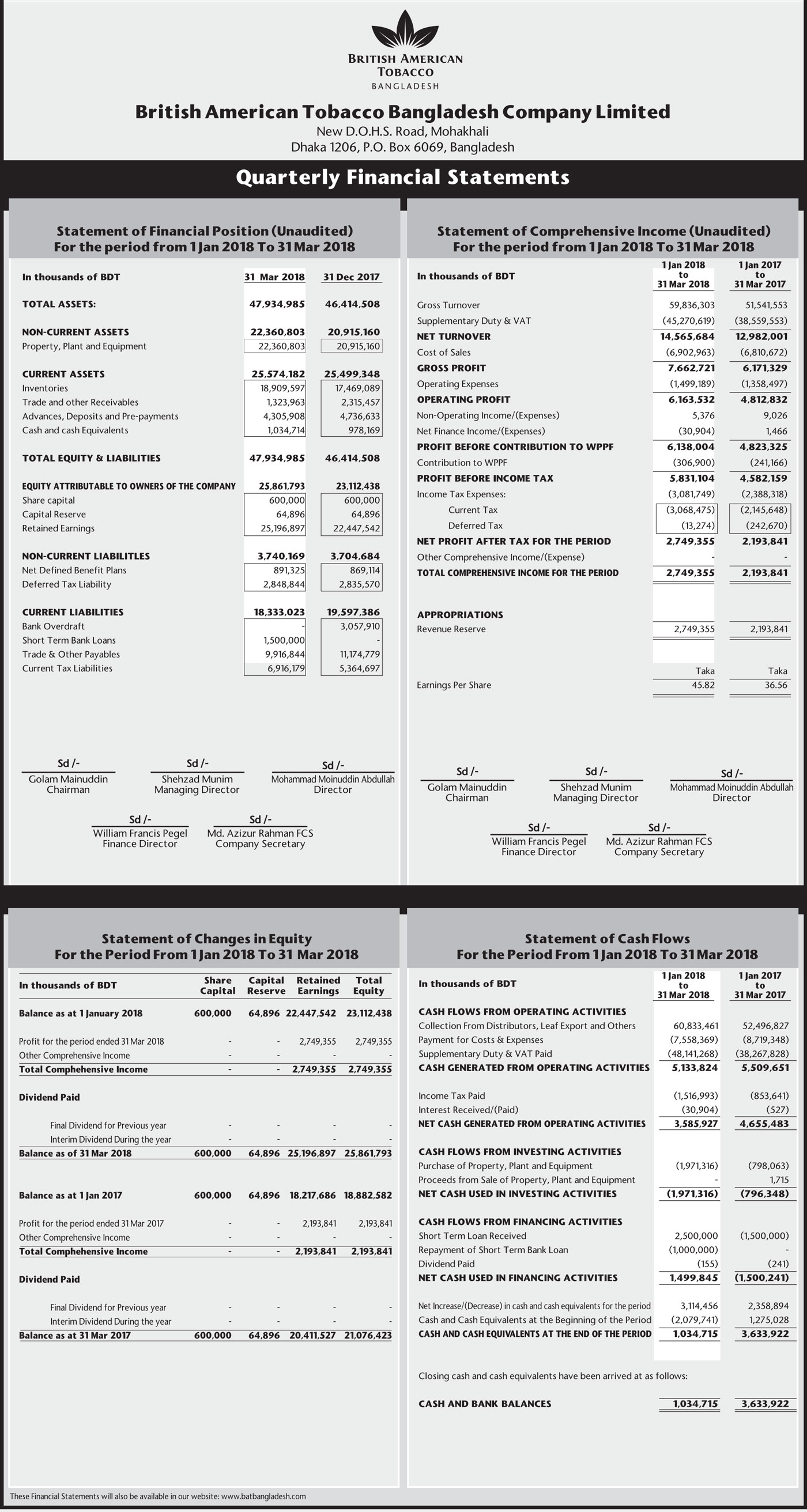 Quarterly Financial Statements of British American Tobacco Bangladesh