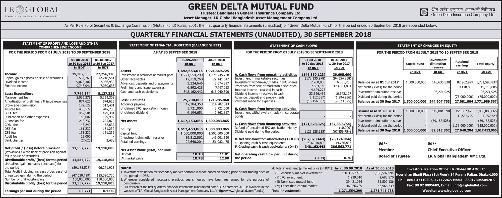 Quarterly Financial Statements (Unaudited) of Green Delta Mutual Fund