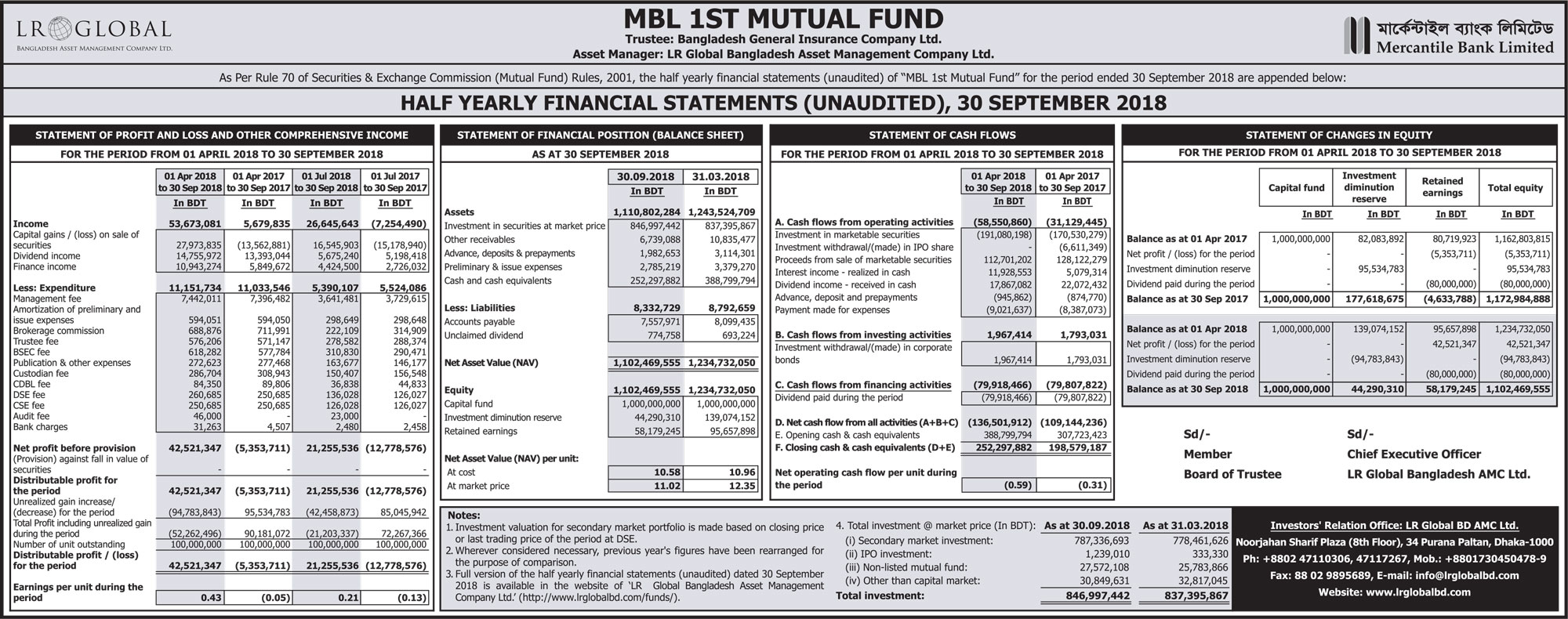 Half Yearly Financial Statements (Unaudited) of MBL 1st Mutual Fund