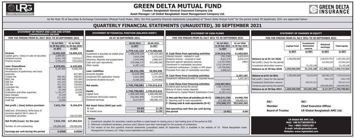 Quarterly Financial Statements (Unaudited) of Green Delta Mutual Fund