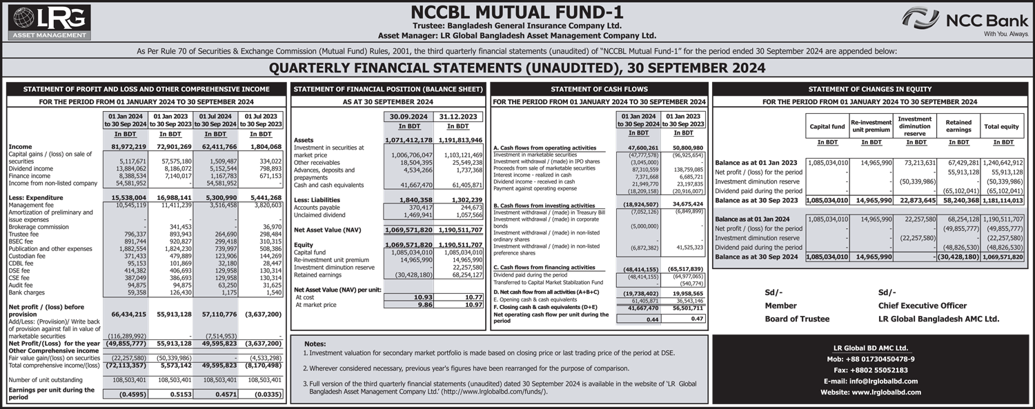 Quarterly Financial Statements (unaudited) of NCCBL Mutual Fund-1