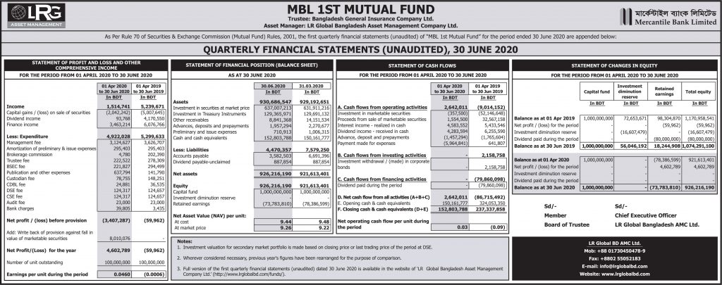 Quarterly Financial Statements (Unaudited), 30 June 2020 Of MBL 1st Mutual Fund