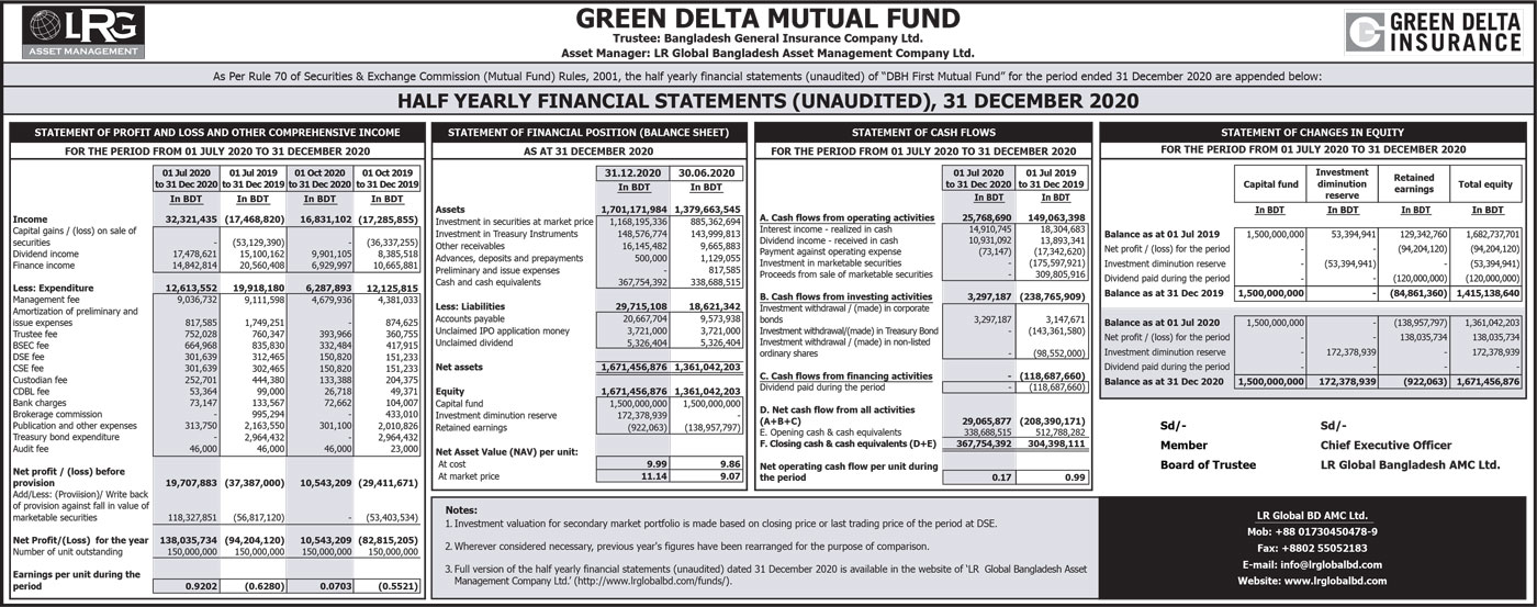 Half Yearly Financial Statements (Unaudited), Dec 2020 of Green Delta Mutual Fund