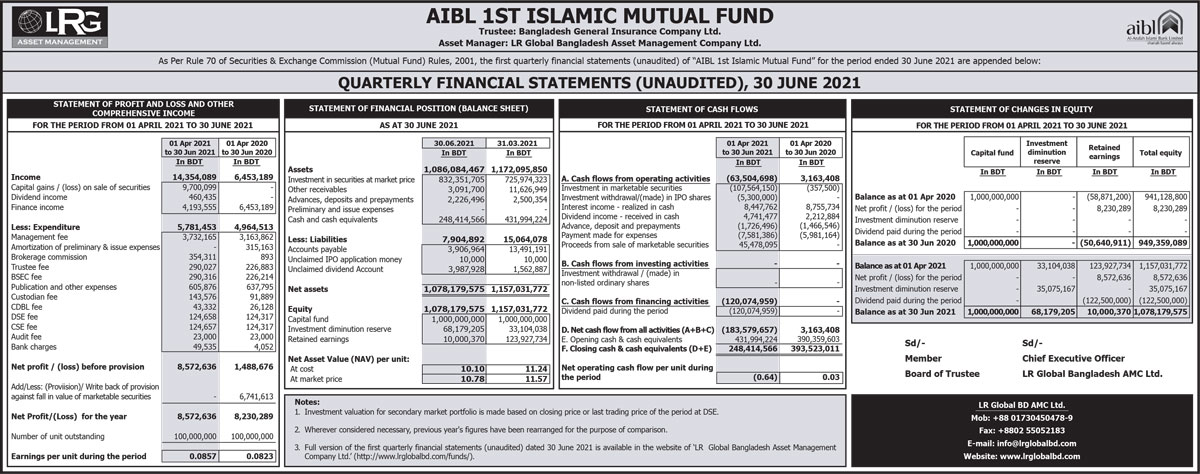 Quarterly Financial Statements (Unaudited) of AIBL 1st Islamic Mutual Fund