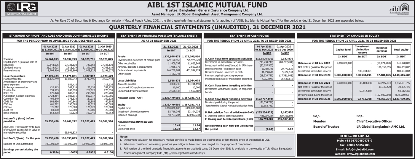 Quarterly Financial Statements (Unaudited) of AIBL 1st Islamic Mutual Fund