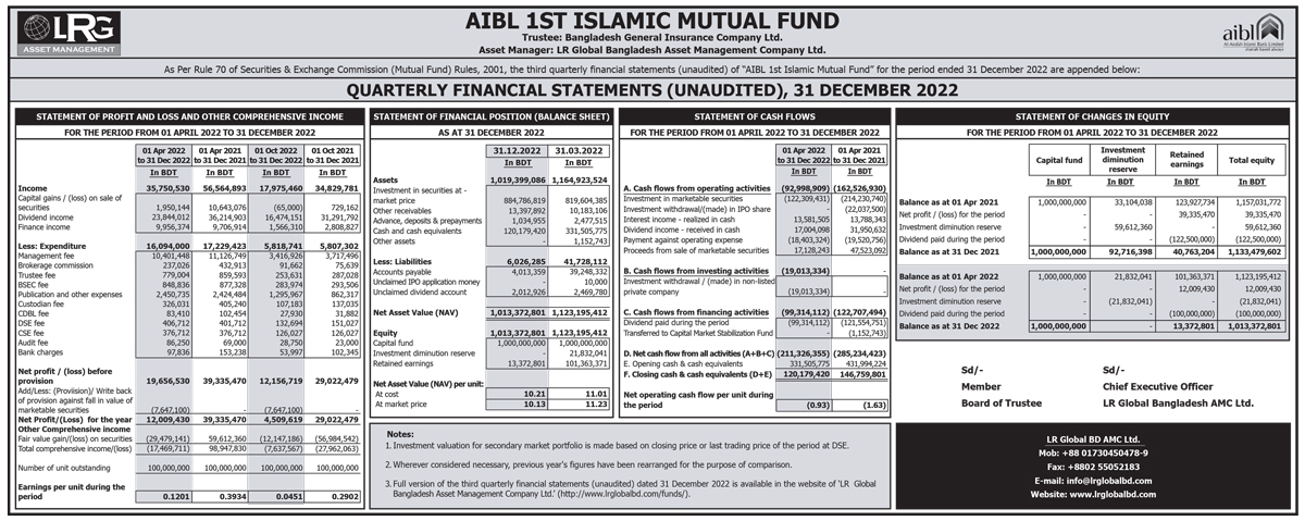 Quarterly Financial Statements (Unaudited) of AIBL 1st Islamic Mutual Fund