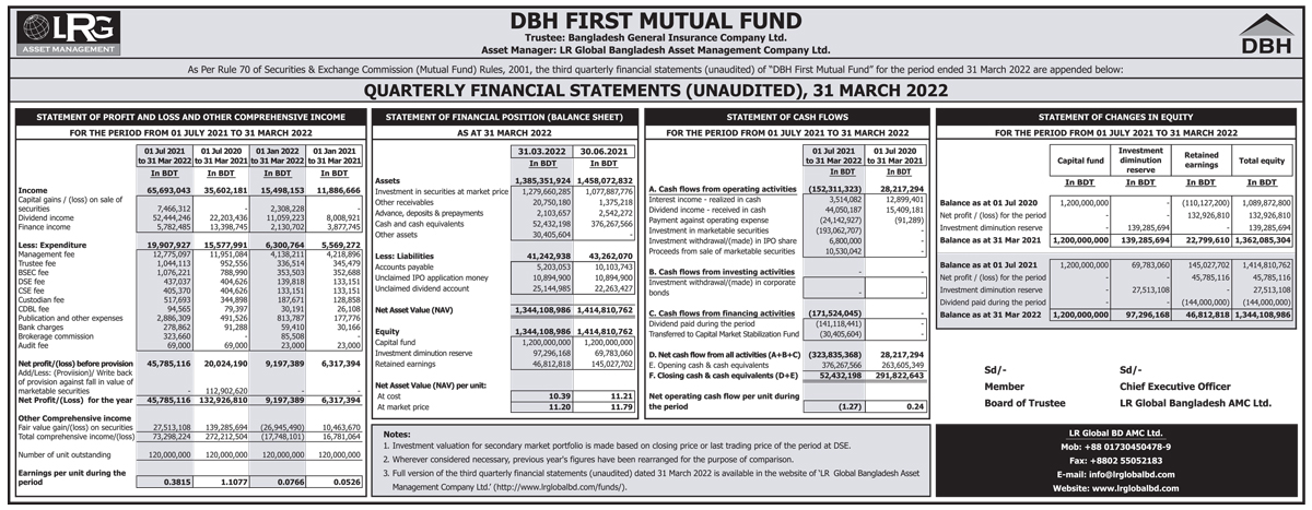 Quarterly Financial Statements (Un-audited) of DBH First Mutual Fund