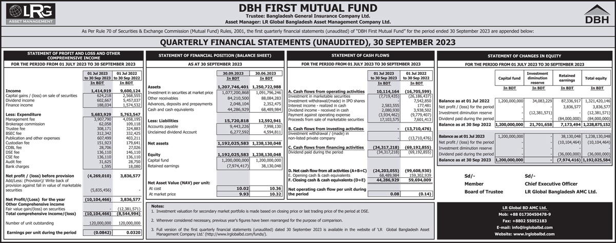 Quarterly Financial Statements (Un-audited) of DBH First Mutual Fund