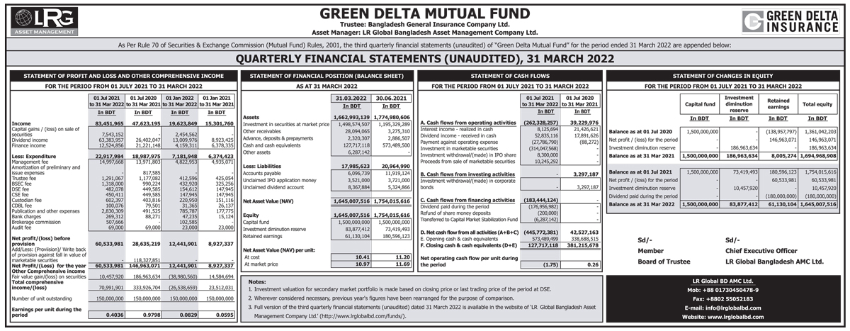 Quarterly Financial Statements (Unaudited) of Green Delta Mutual Fund