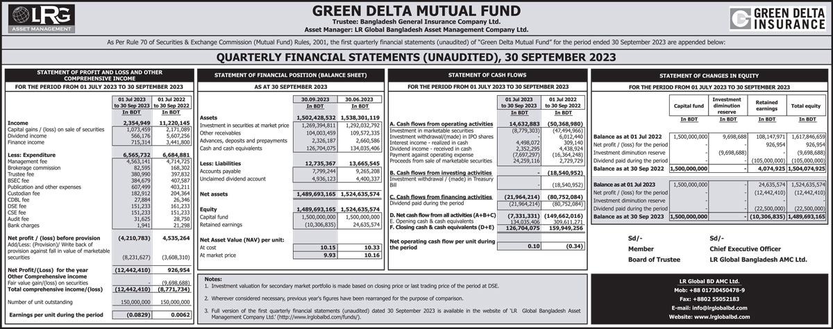 Quarterly Financial Statements (Unaudited) of Green Delta Mutual Fund