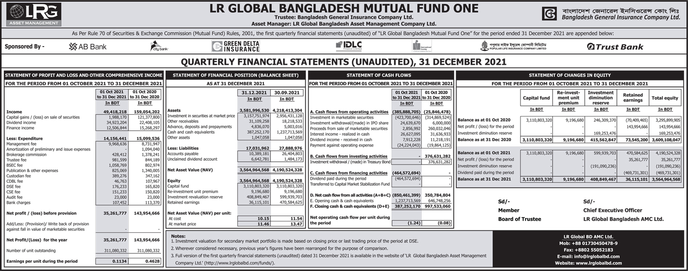 Quarterly Financial Statements (Un-audited) of LR Global Bangladesh Mutual Fund One