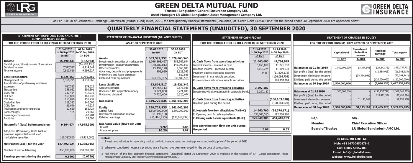 Quarterly Financial Statements (Unaudited), Sep 2020 of Green Delta Mutual Fund