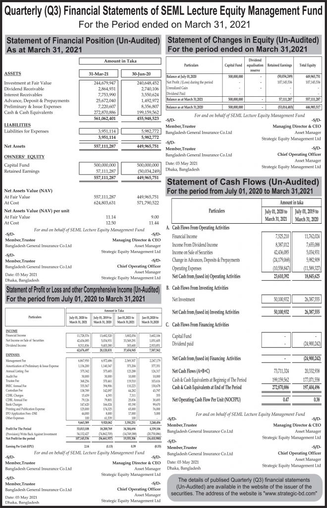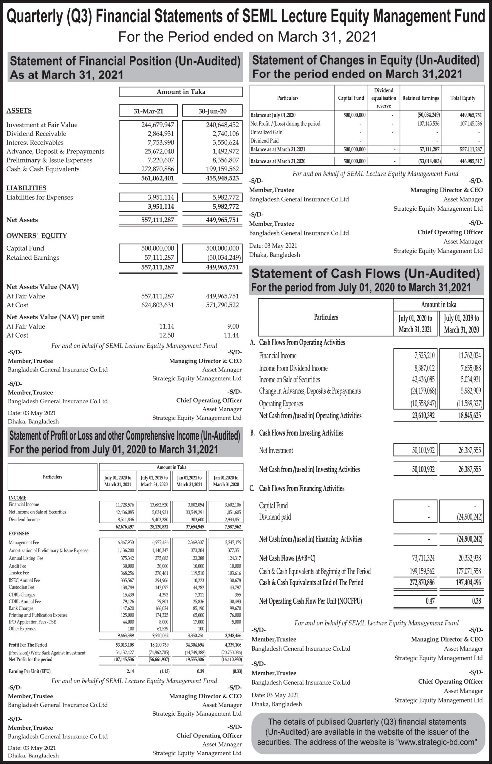 Q3 Financial Statements (Un-audited) of SEML Lecture Equity Management Fund