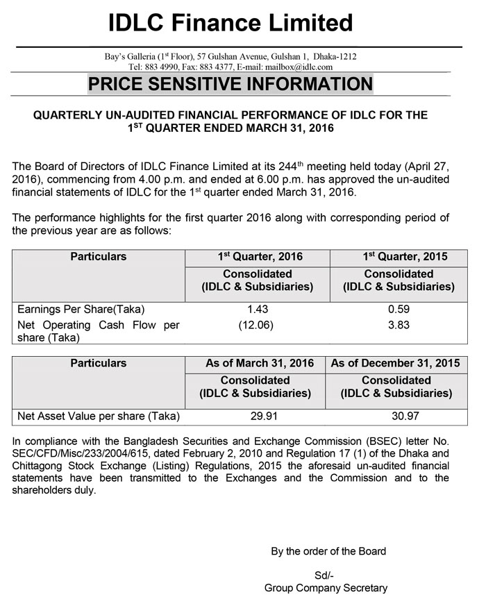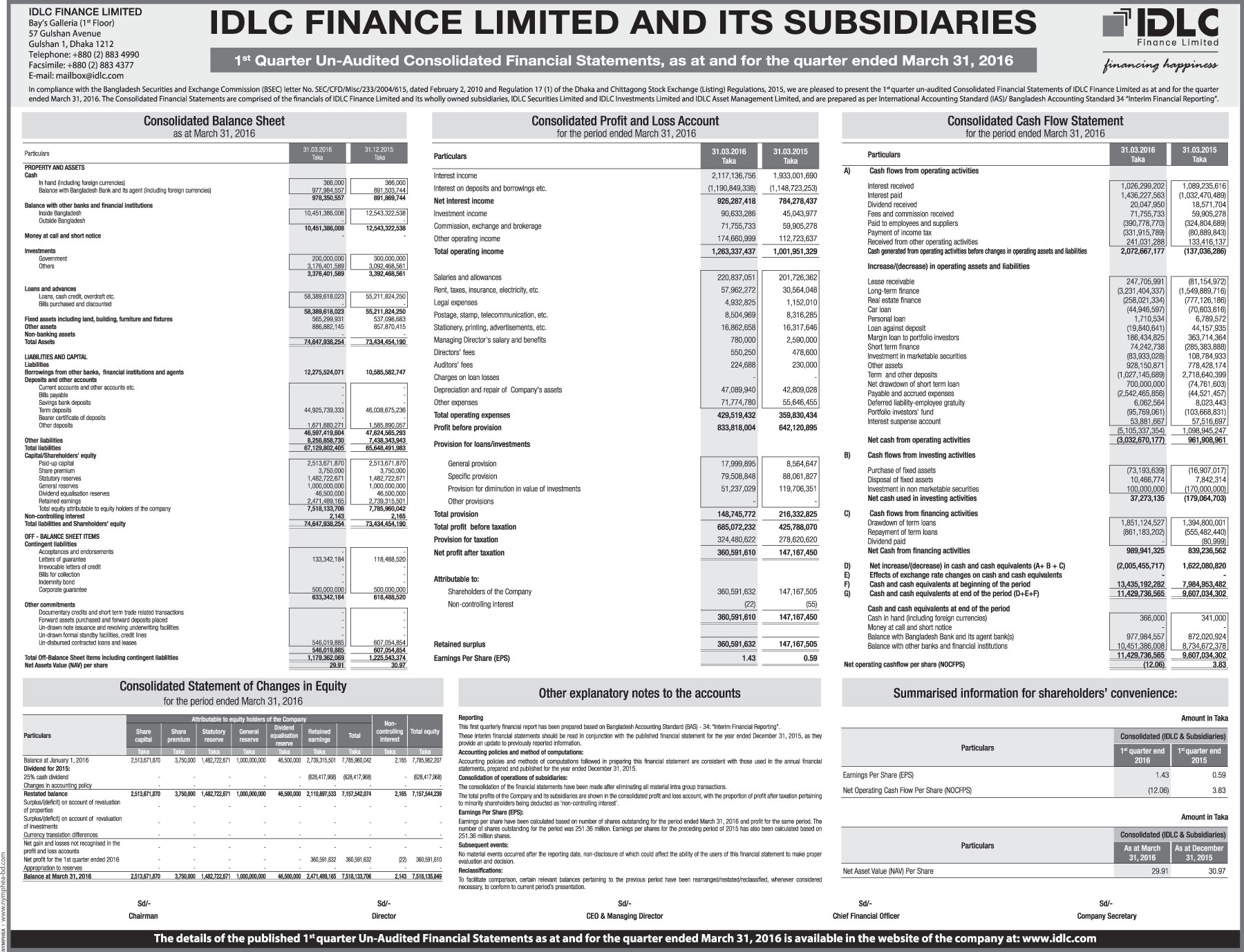 financial statements of IDLC for the 1st quarter ended March 31, 2016.