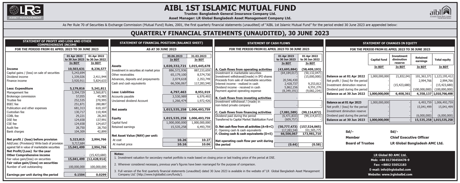 Quarterly Financial Statements (Unaudited) of AIBL 1st Islamic Mutual Fund