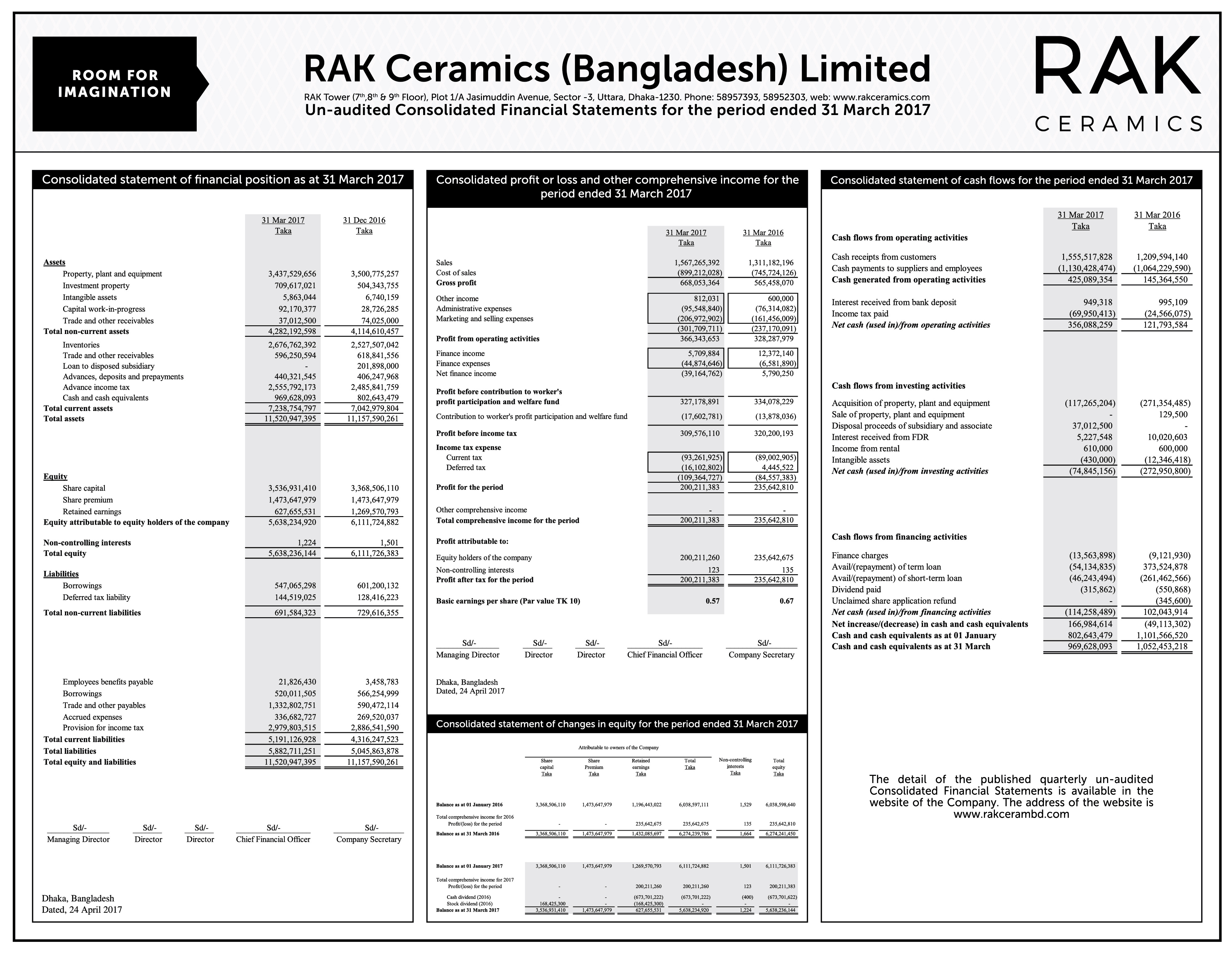 RAK CERAMICS BANGLADESH LIMITED FINANCIAL STATEMENTS 31March 2017