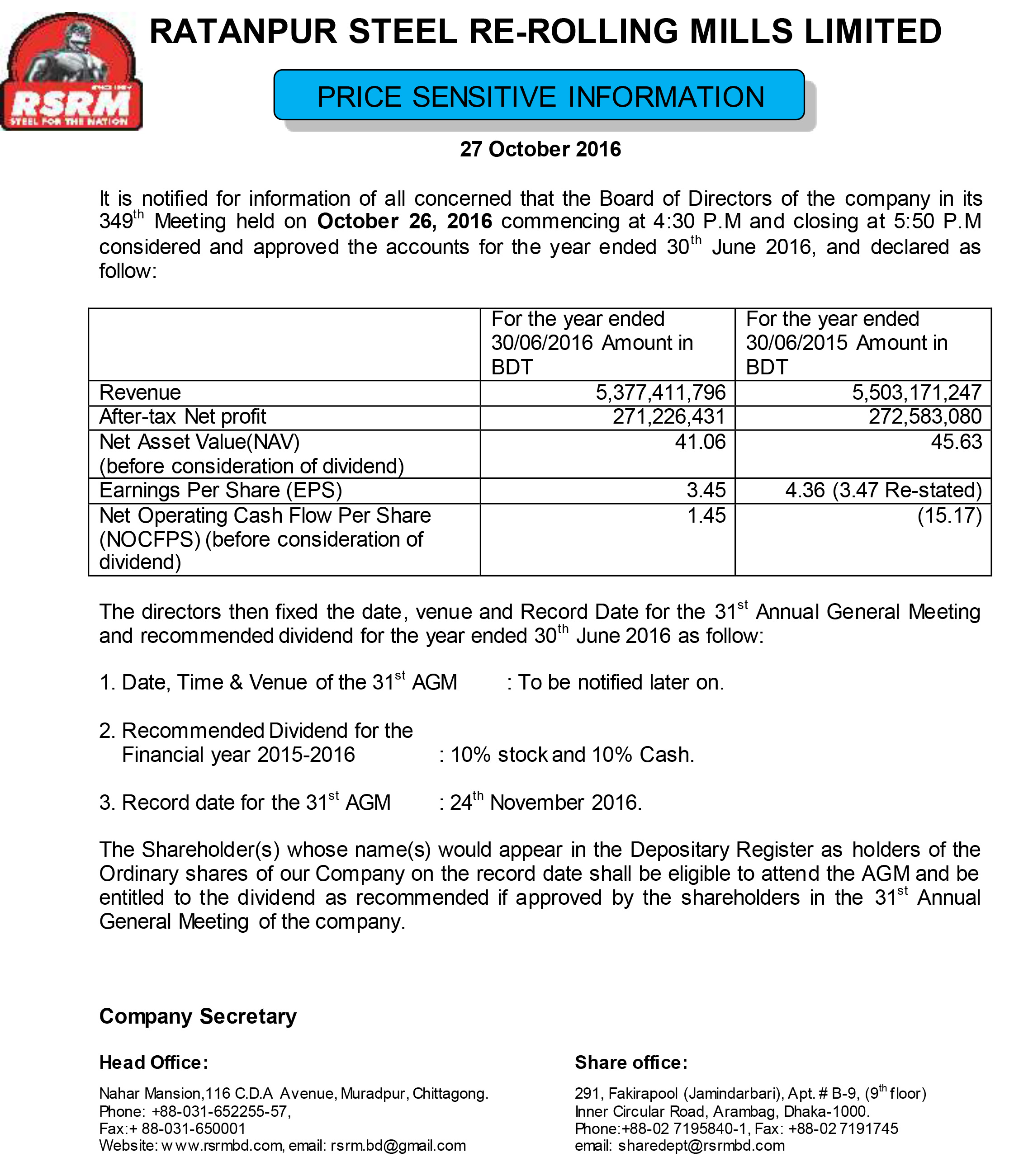 Ratanpur Steel Re-Rolling Mills Limited Price Sensitive Information 2016