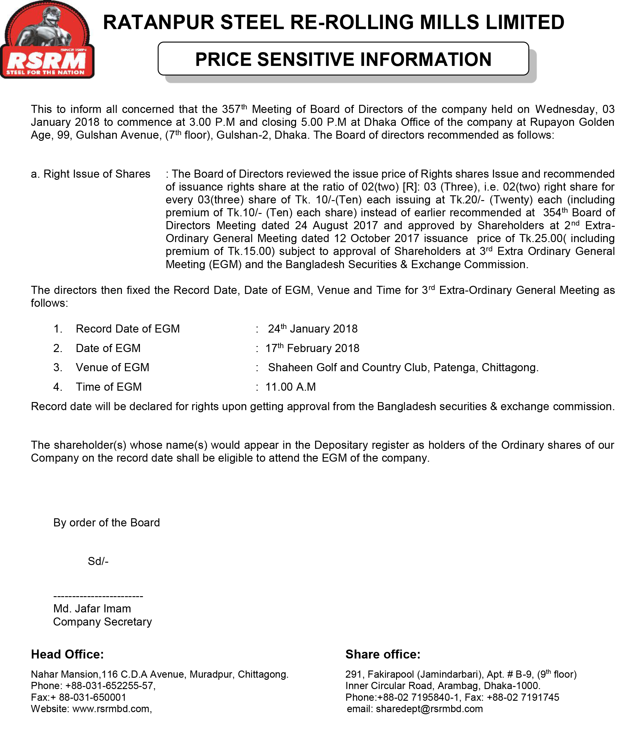 Ratanpur Steel Re-Rolling Mills Ltd. Price Sensitive Information