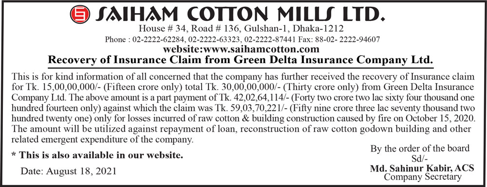 Recovery of Insurance Claim from Green Delta Insurance Company Ltd. of Saiham Cotton Mills Ltd.