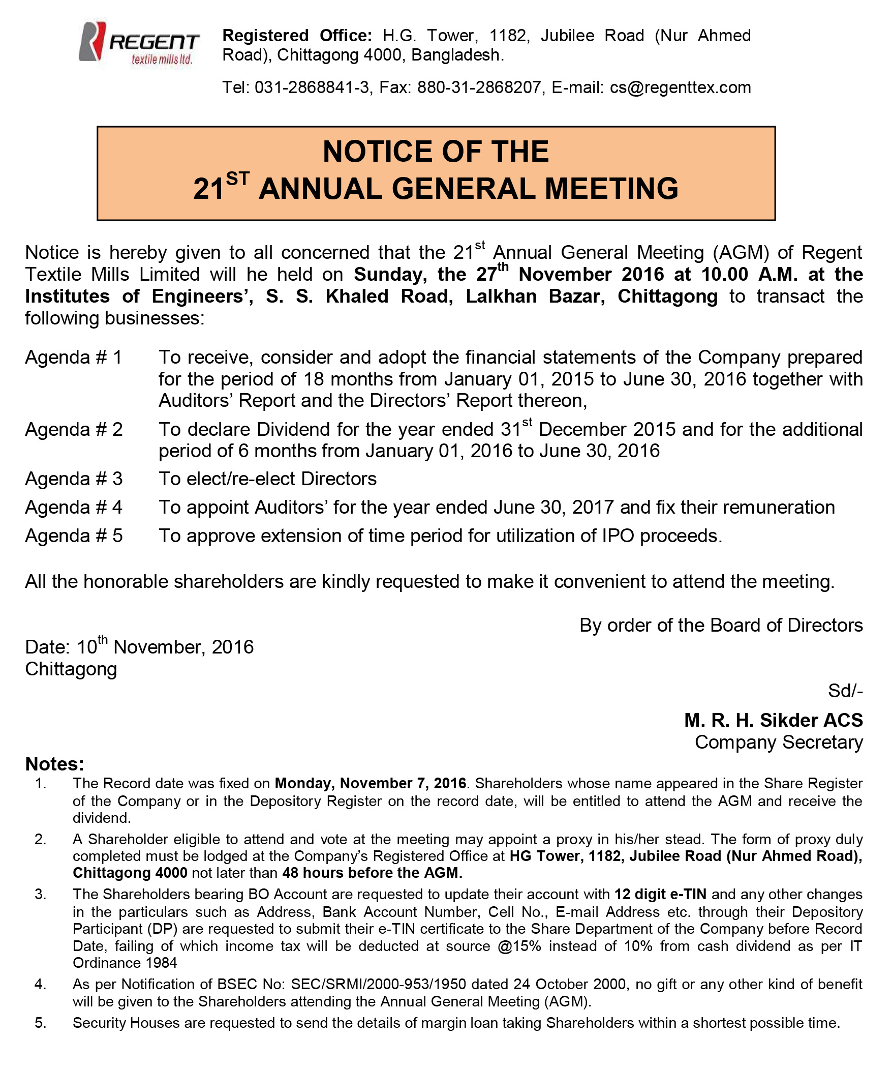 Regent Textile Mills Limited Notice of 21st Annual General Meeting