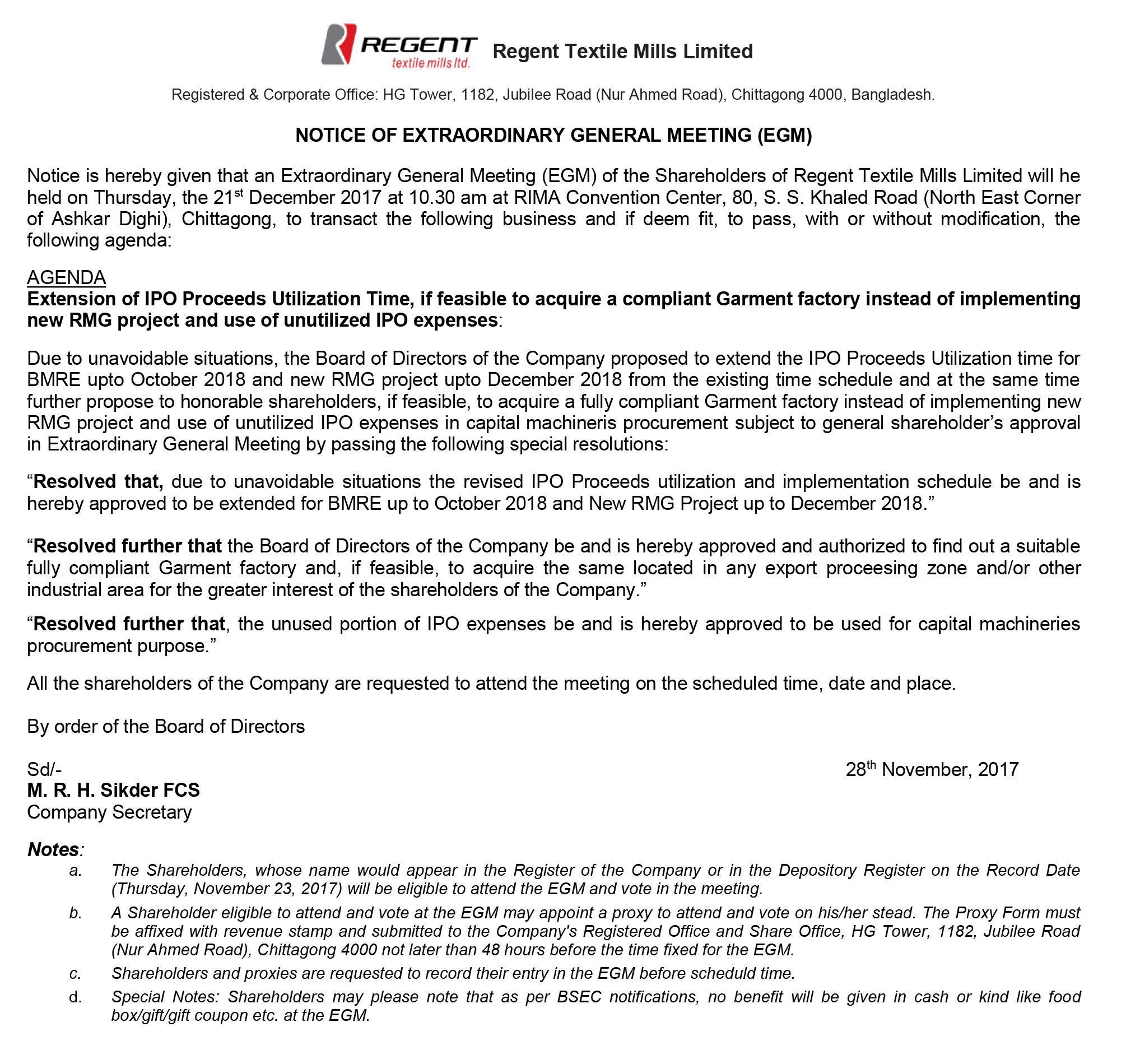 Regent Textile Mills Limited Notice of Extraordinary General Meeting (EGM)