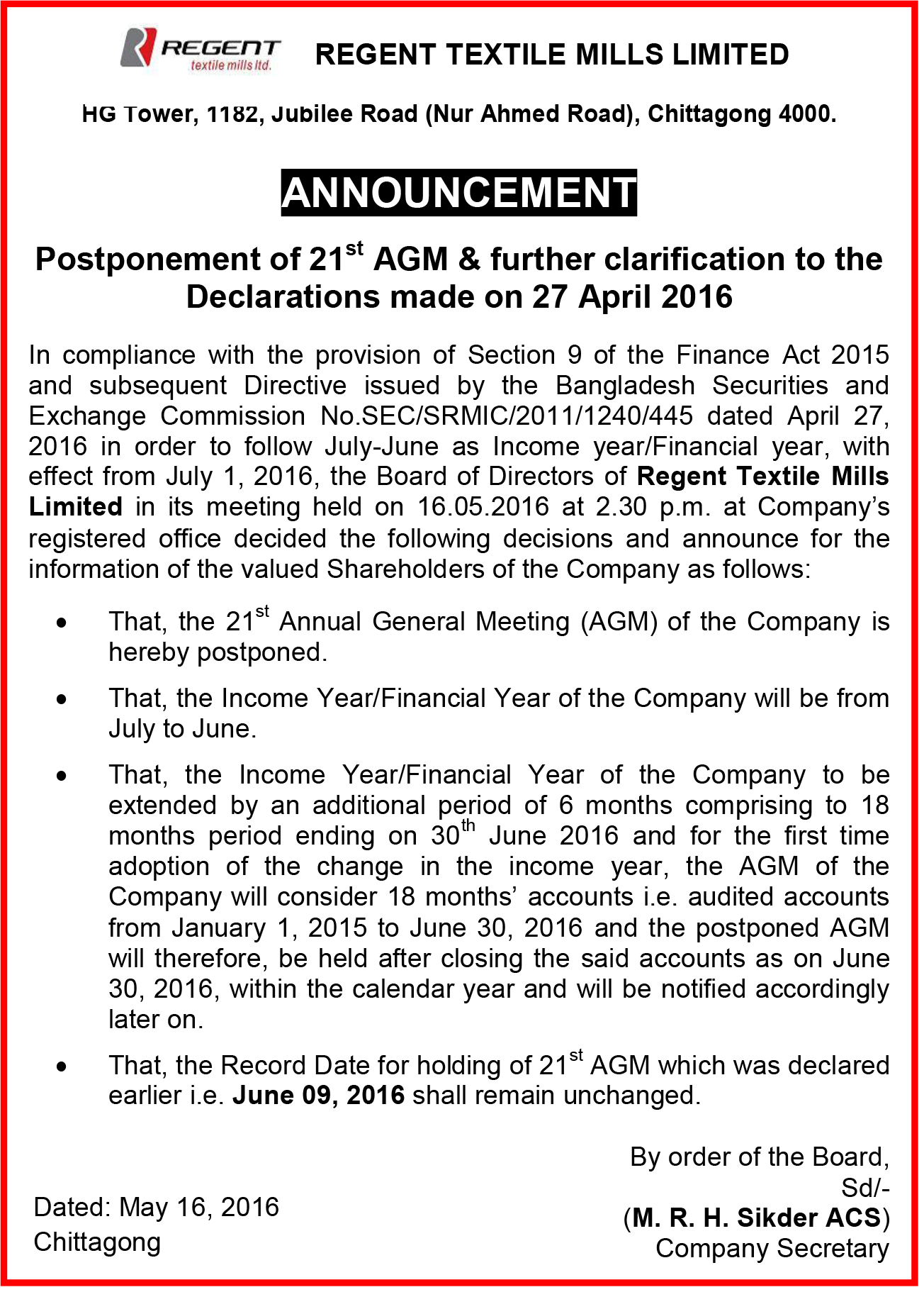 In compliance with the provision of Section 9 of the Finance Act 2015 and subsequent Directive issued by the Bangladesh Securities and Exchange Commission No.SEC/SRMIC/2011/1240/445 dated April 27, 2016 in order to follow July-June as Income year/Financial year, with effect from July 1, 2016, the Board of Directors of Regent Textile Mills Limited in its meeting held on 16.05.2016 at 2.30 p.m. at Company’s registered office decided the following decisions and announce for the information of the valued Shareholders of the Company as follows: