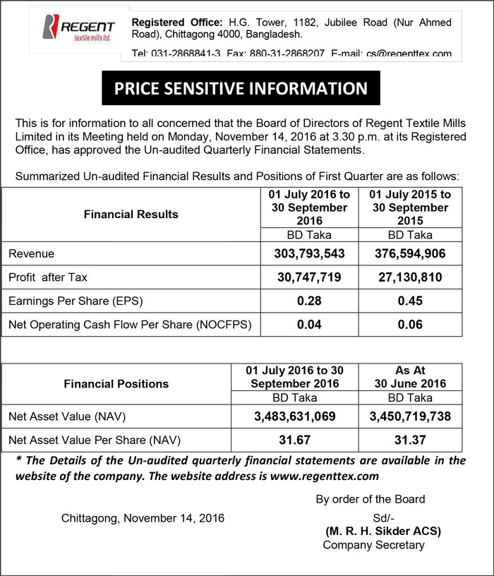 Q1 Unaudited Financial Statements of Regent Textile Mills Limited