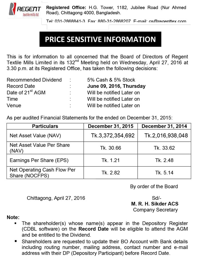 This is for information to all concerned that the Board of Directors of Regent