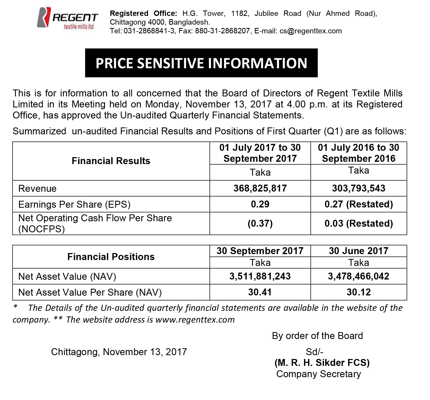 Q1 Unaudited Financial Statements of Regent Textile Mills Limited