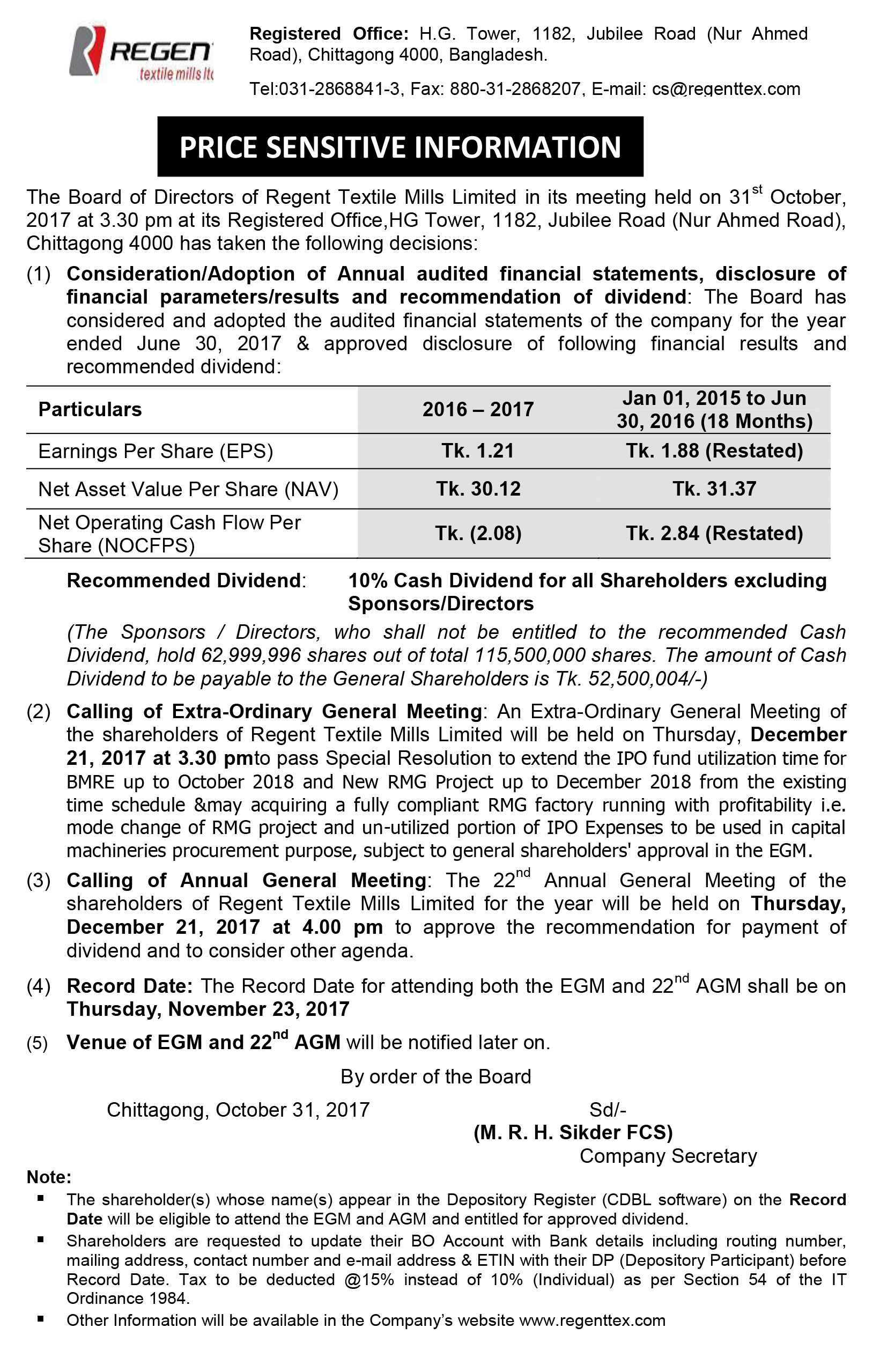 Distribution of Cash Dividend of Regent Textile Mills Ltd.