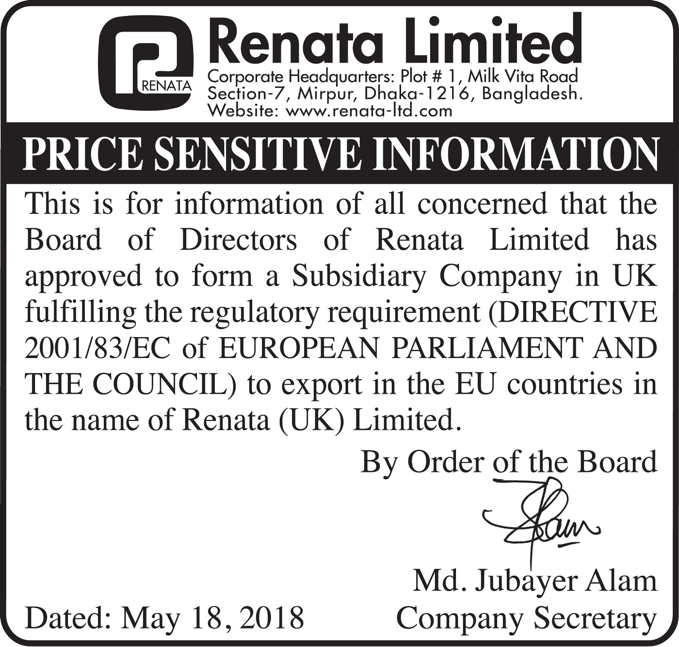 Price Sensitive Information of Renata PLC.