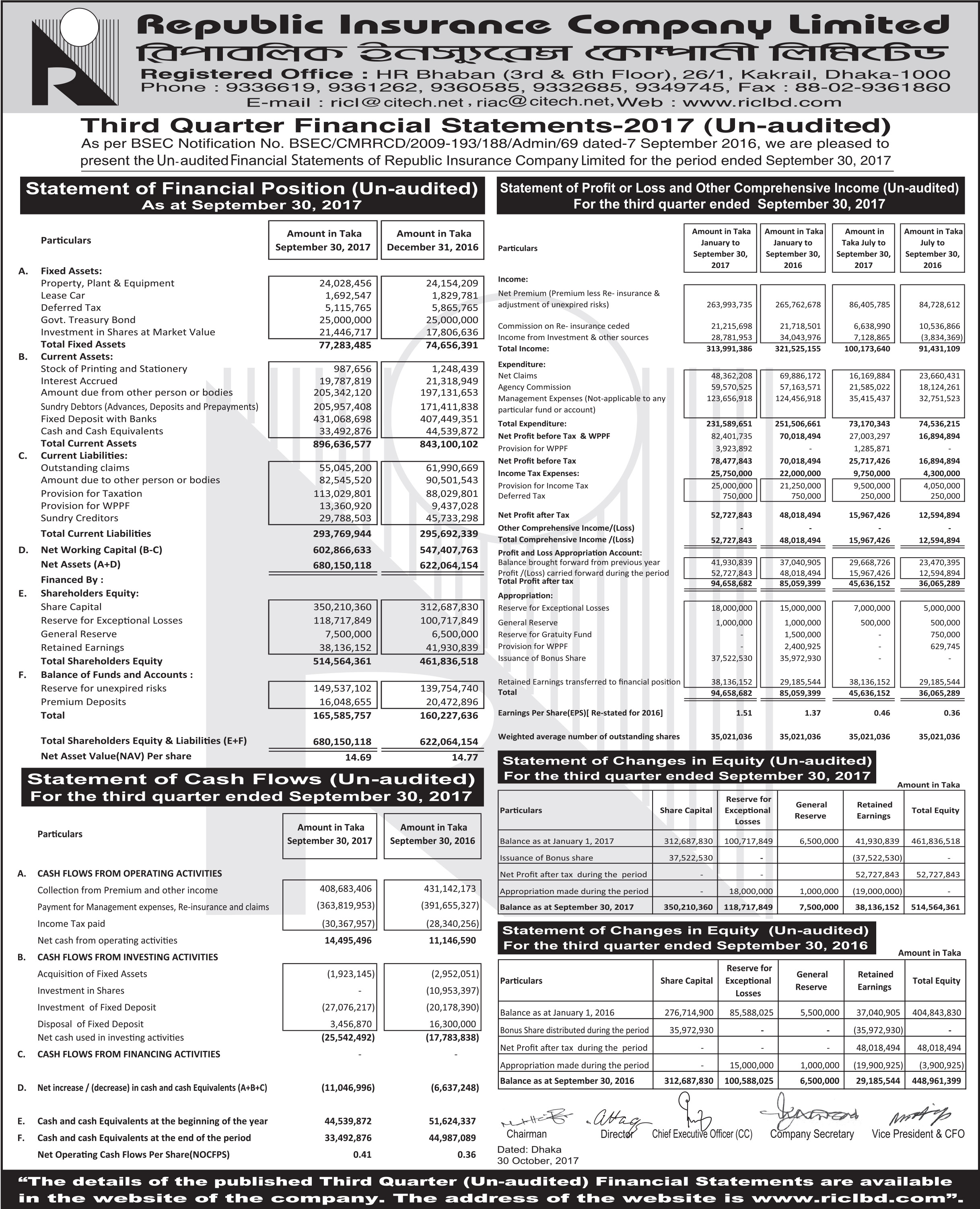 Q3 Un-audited Financial Statements of Republic Insurance Company Limited