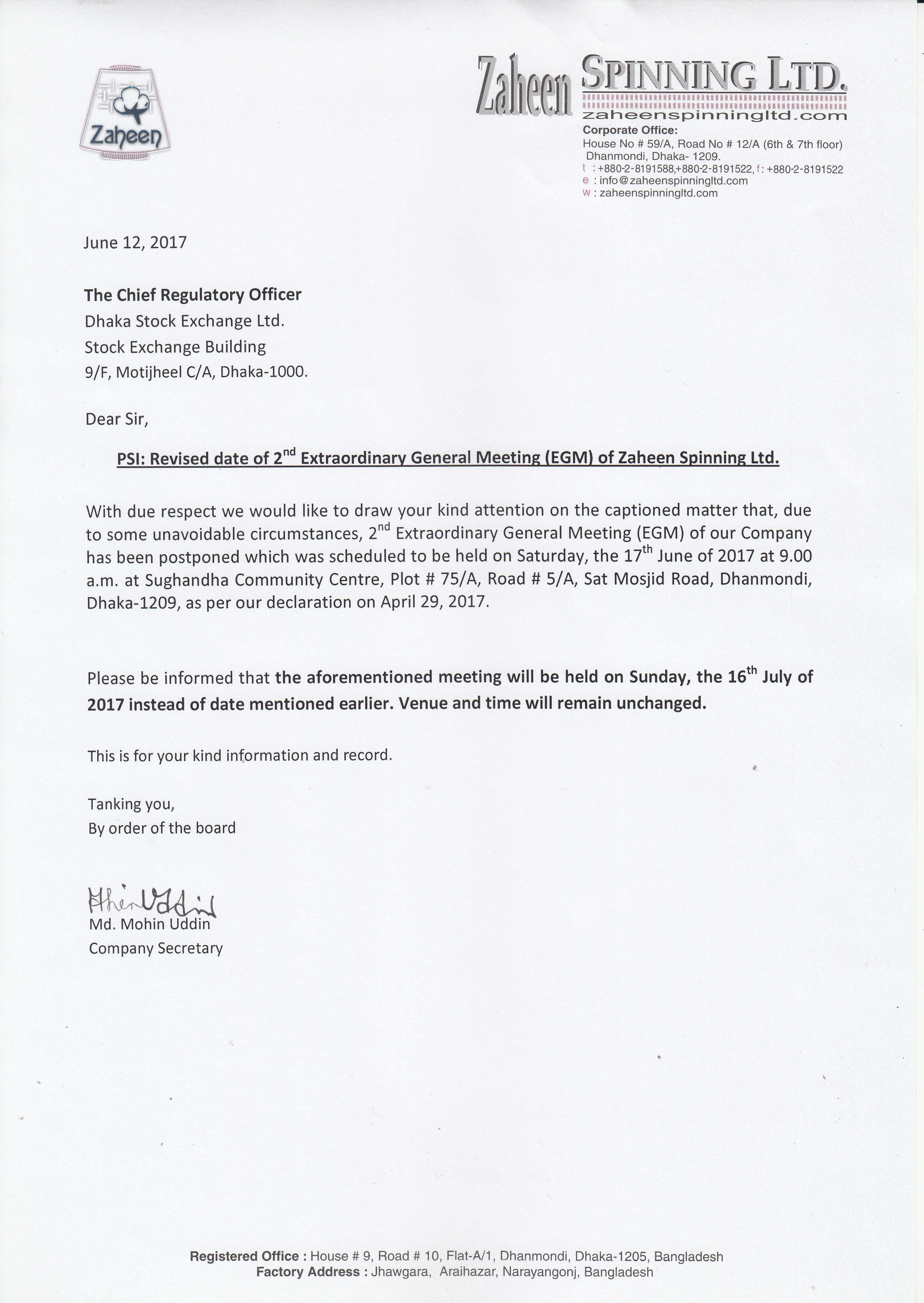 Revised date of 2nd Extraordinary General Meeting (EGM) of Zaheen Spinning Ltd.
