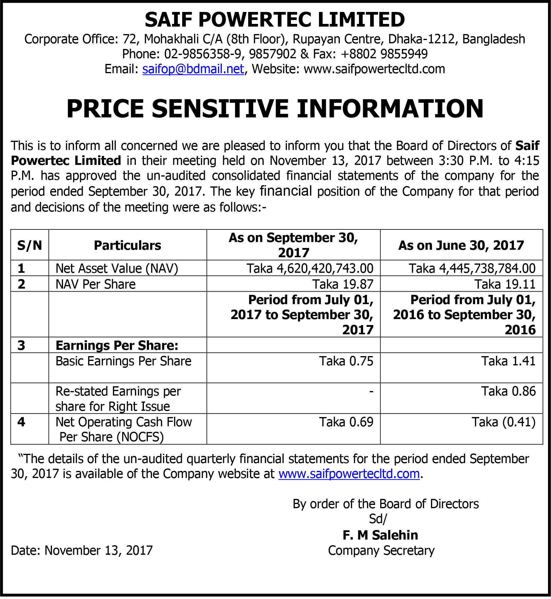 SAIF POWERTEC LIMITED Price Sensitive Information