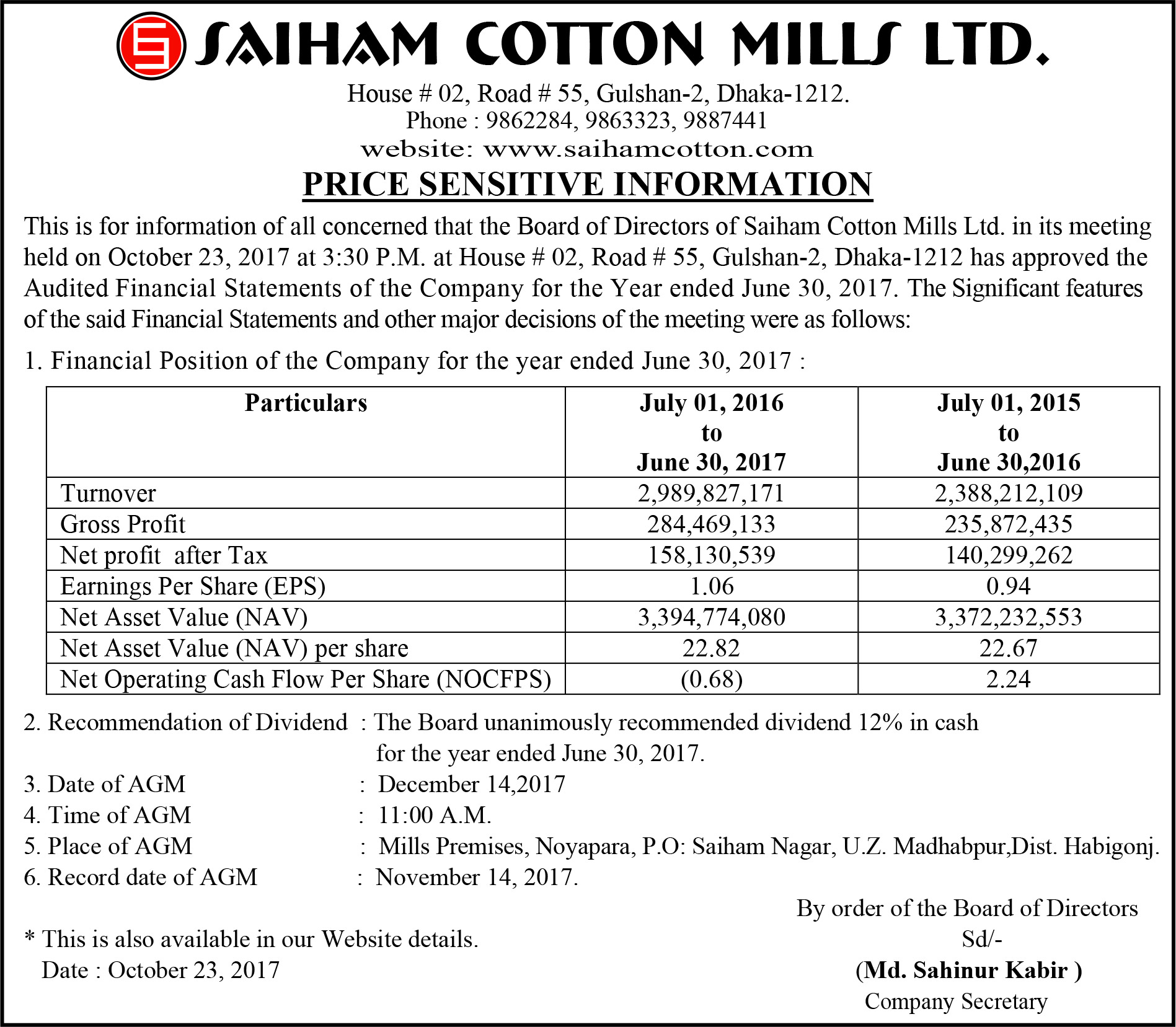 Price Sensitive Information of Saiham Cotton Mills Limited