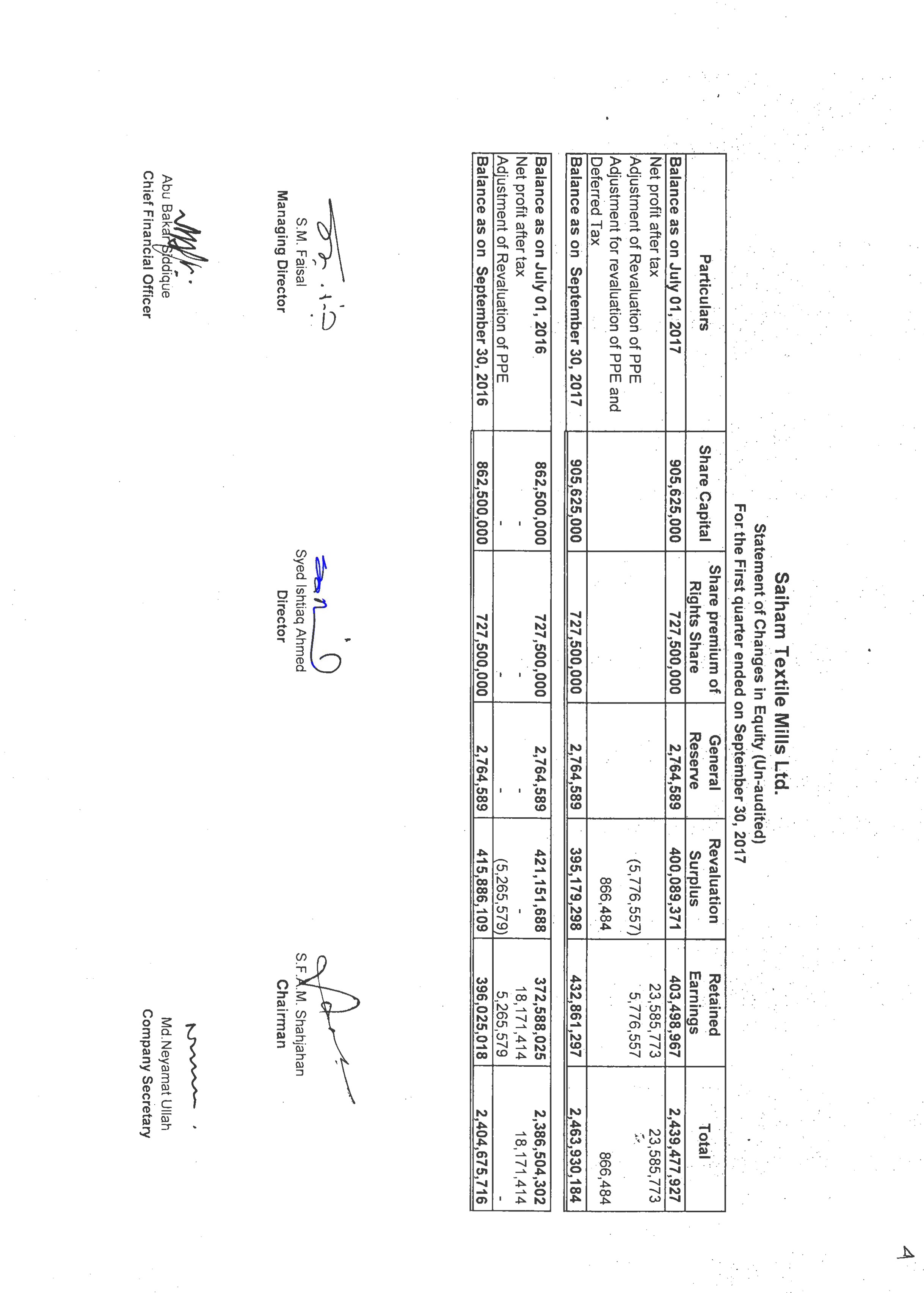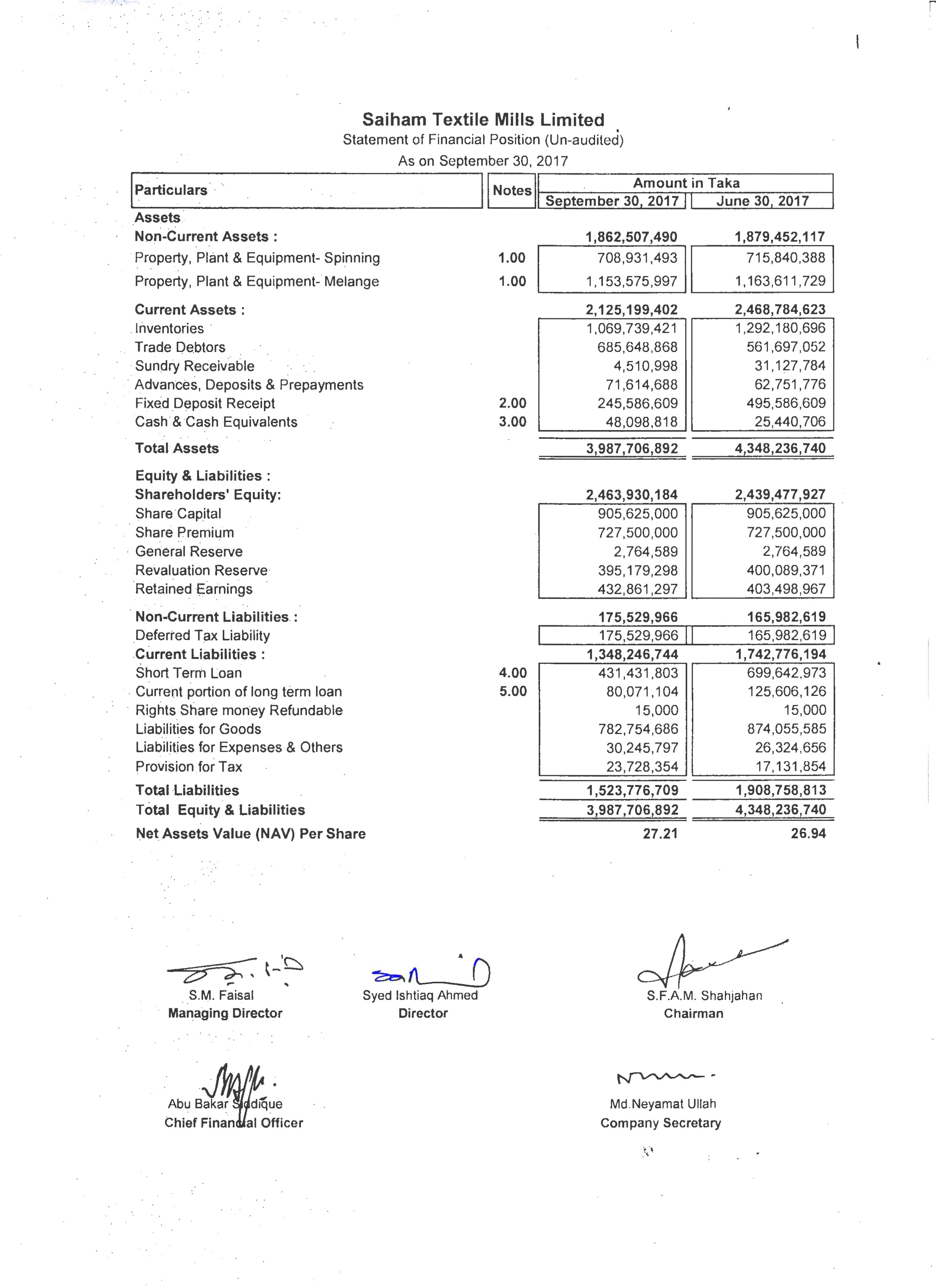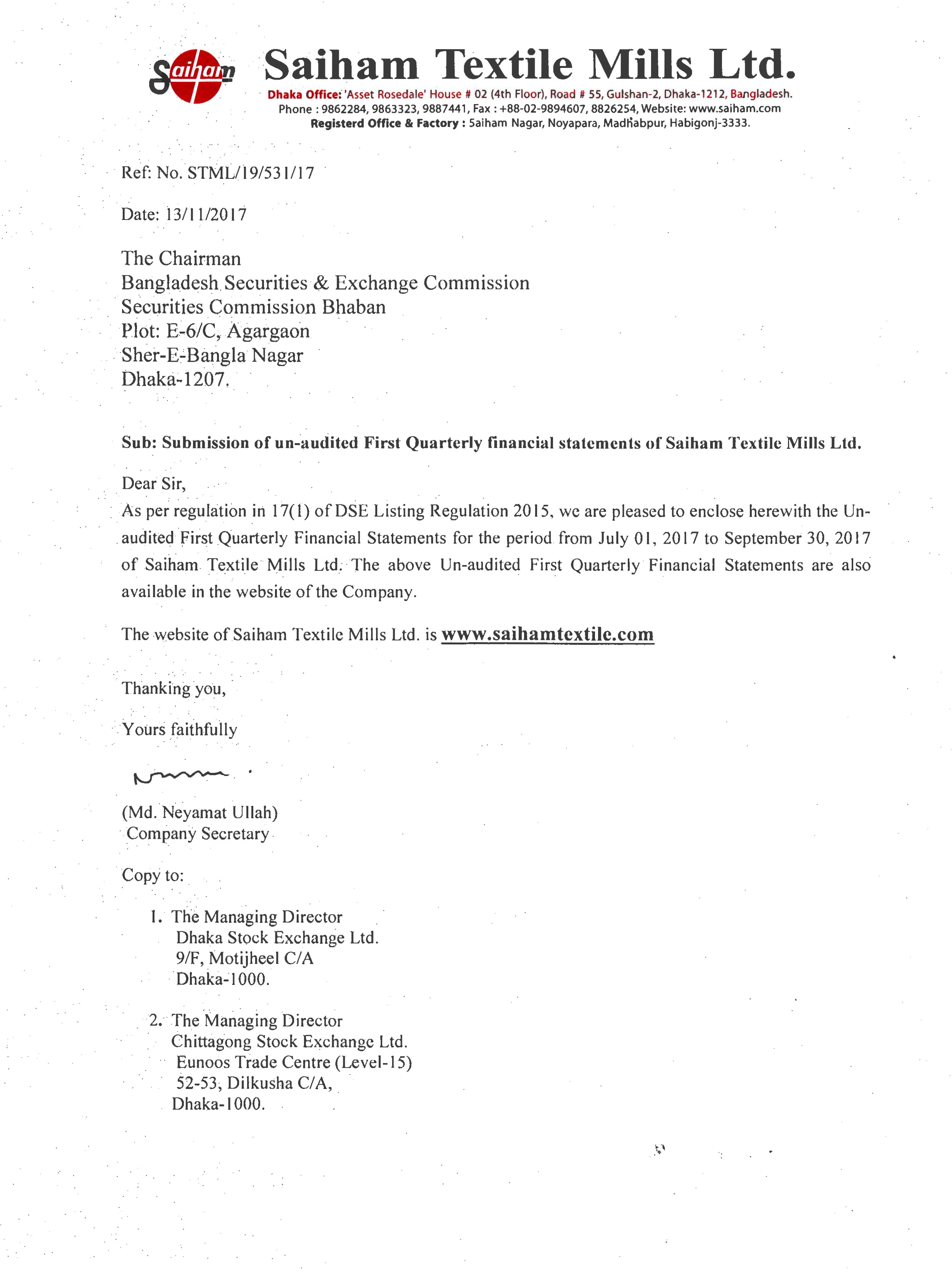 Saiham Textile Mills Ltd. Q2 Un-audited Financial Statements